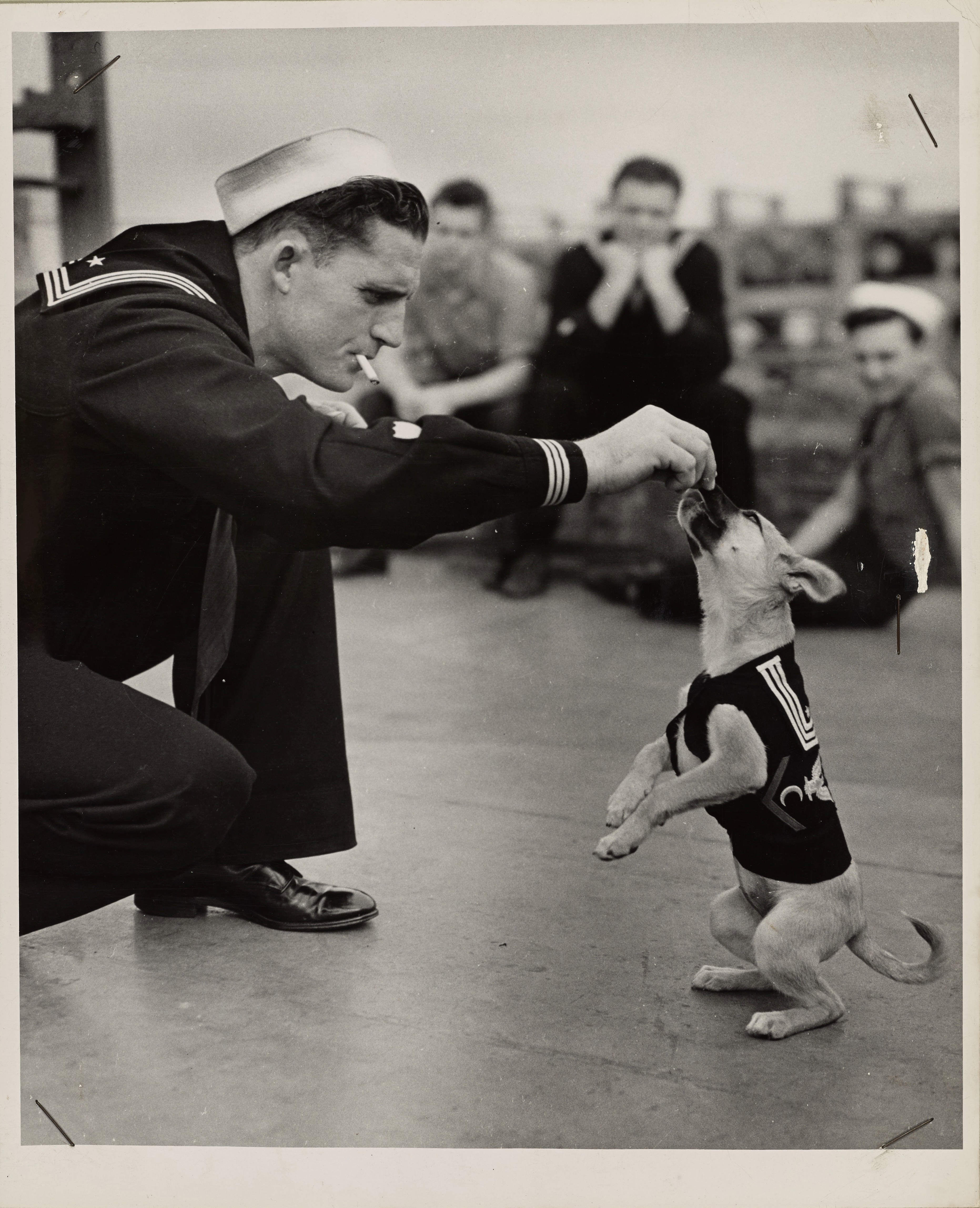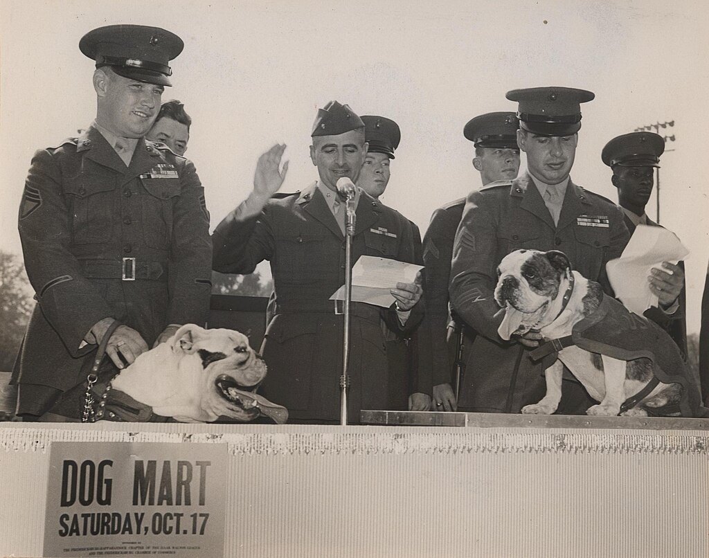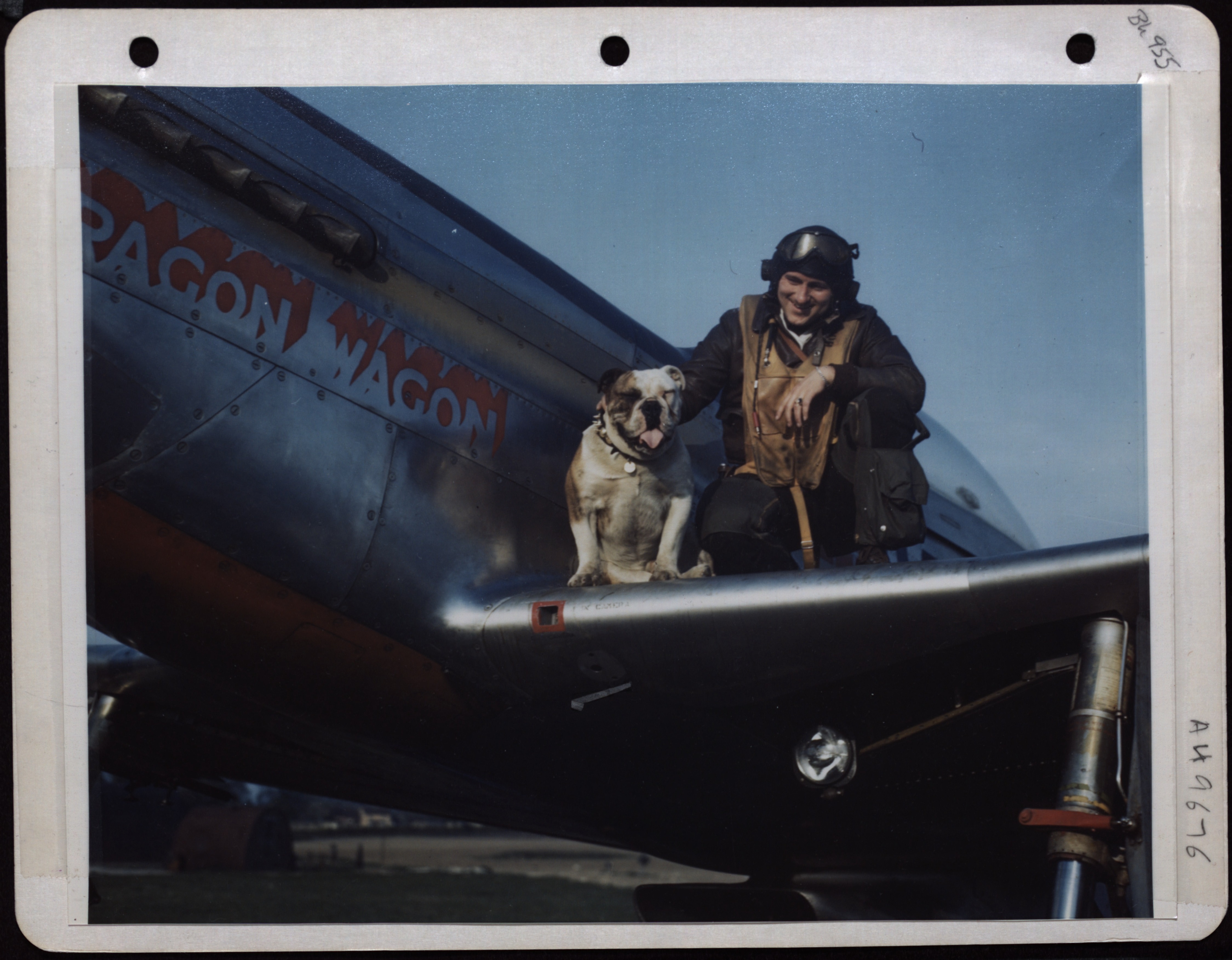 >>64775983we mascot posting?>Mascot Meets Master. The English Bull ['Yank'], mascot of the Us 8th AF Base, meets his master, Capt. James Duffy of Mt. Clair, N. J., upon the pilot's Return from a mission.