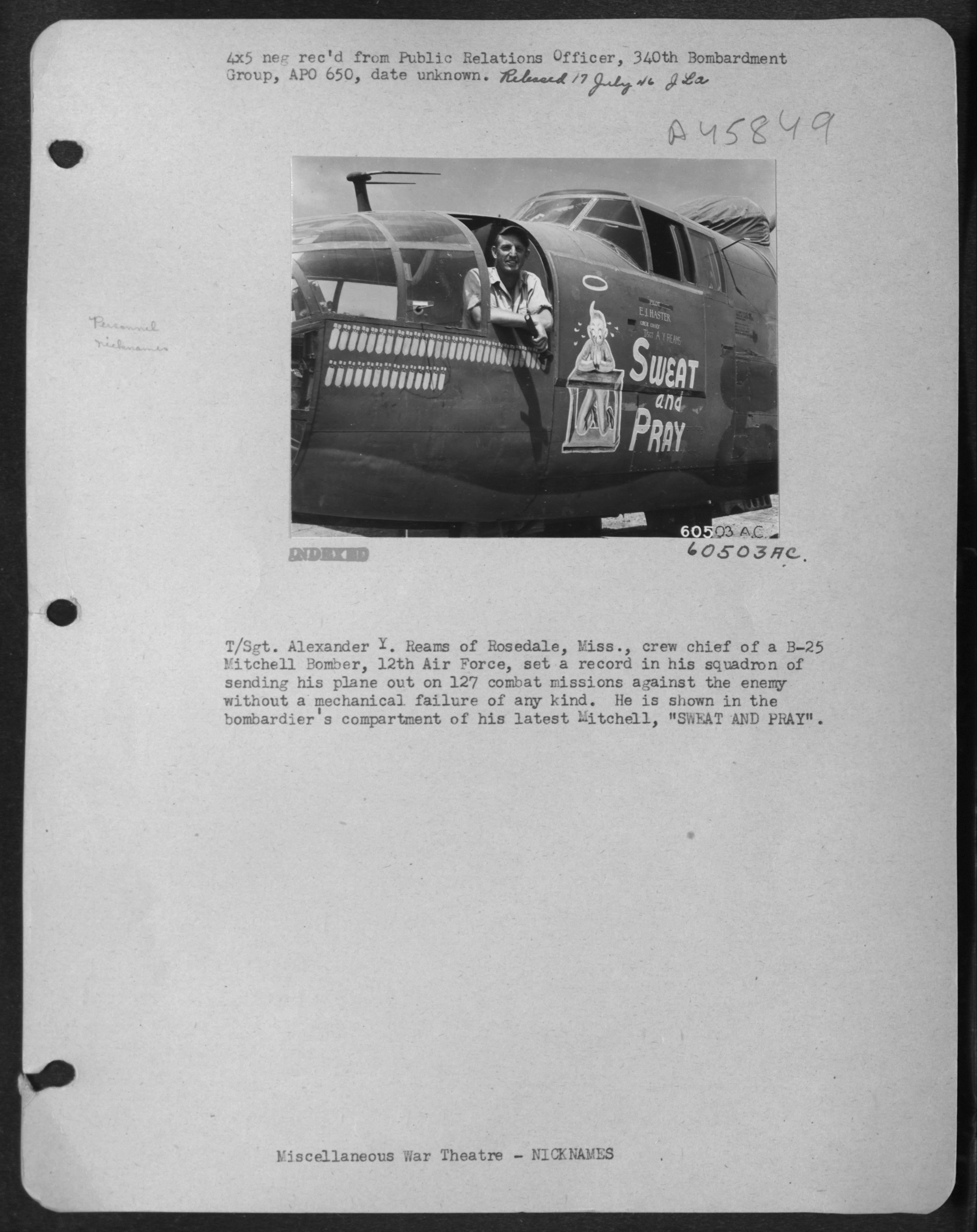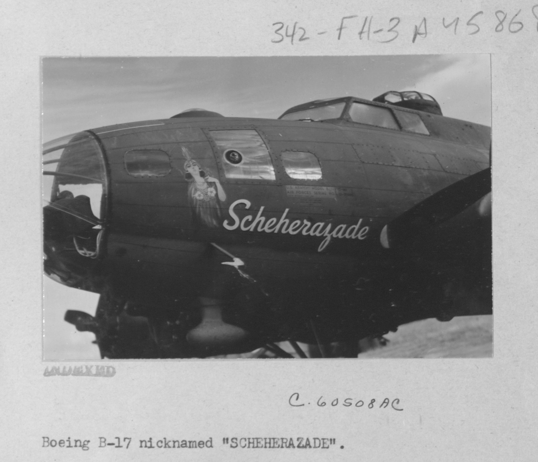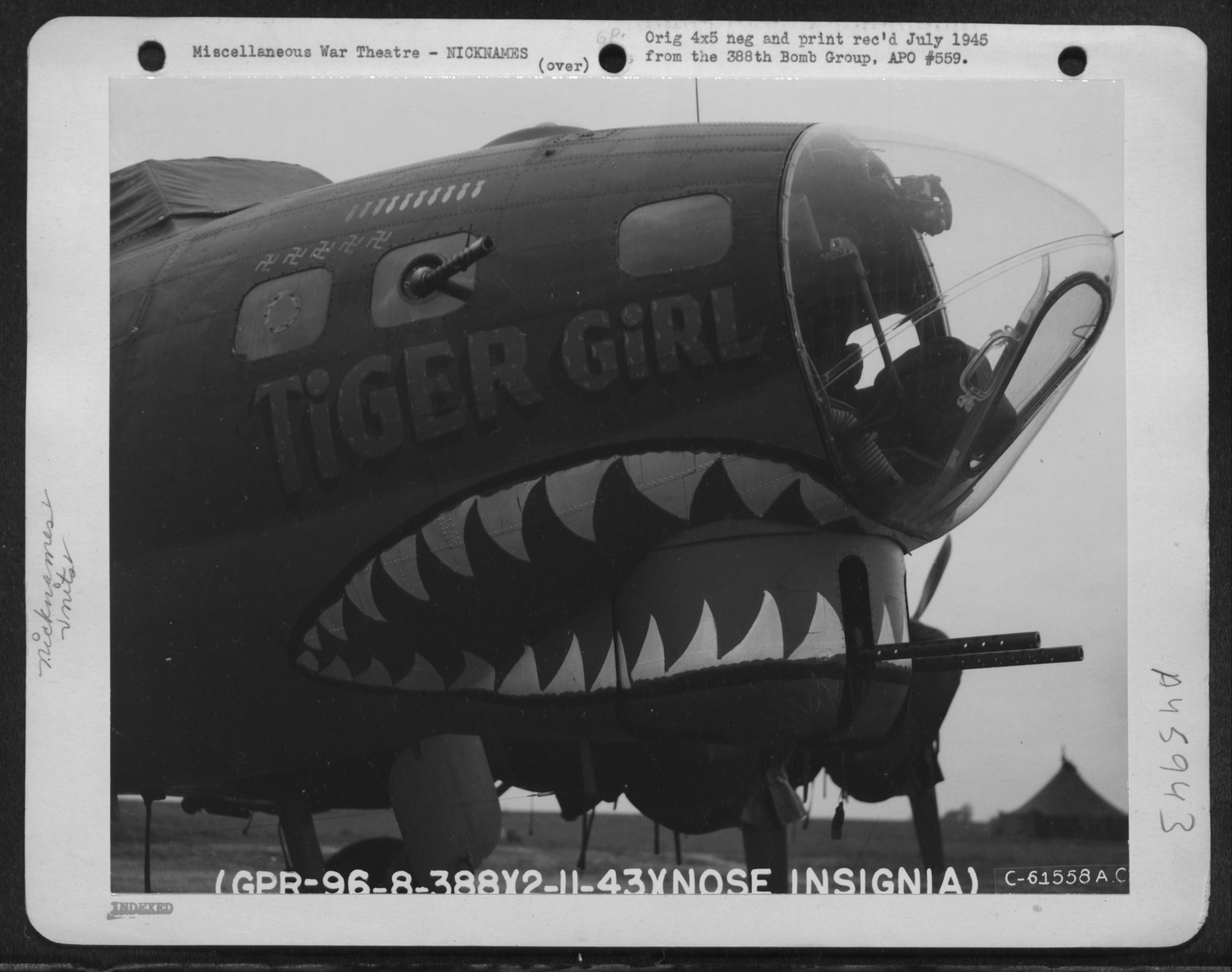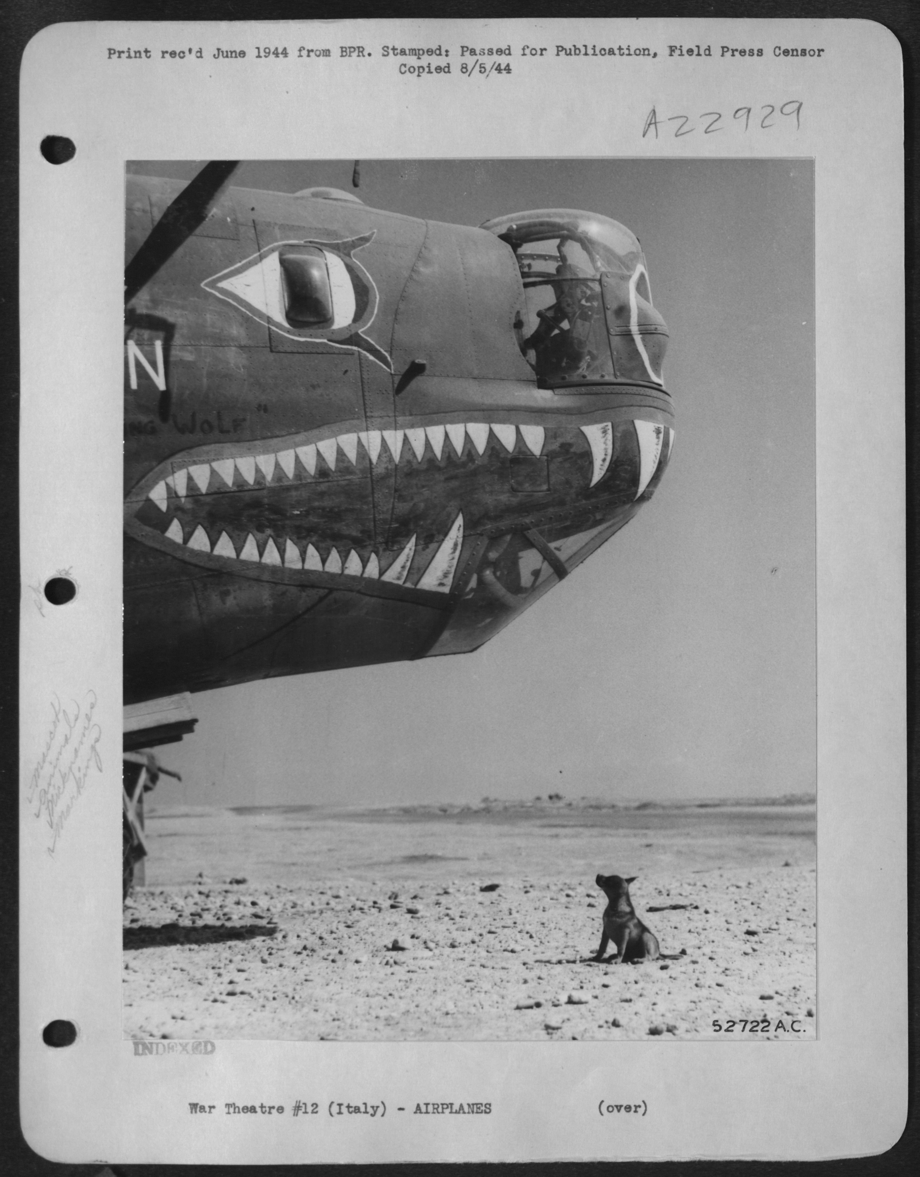 >"Frank" a 15th AAF group mascot, looks on approvingly at the nose decorations on "Howling Wolf," a Consolidated B-24 Liberator, based in southern Italy, one of the many 15th AAF heavy bombers howling over German territory. "Adolph" is much more affected by "Howling Wolf" than is the pup.