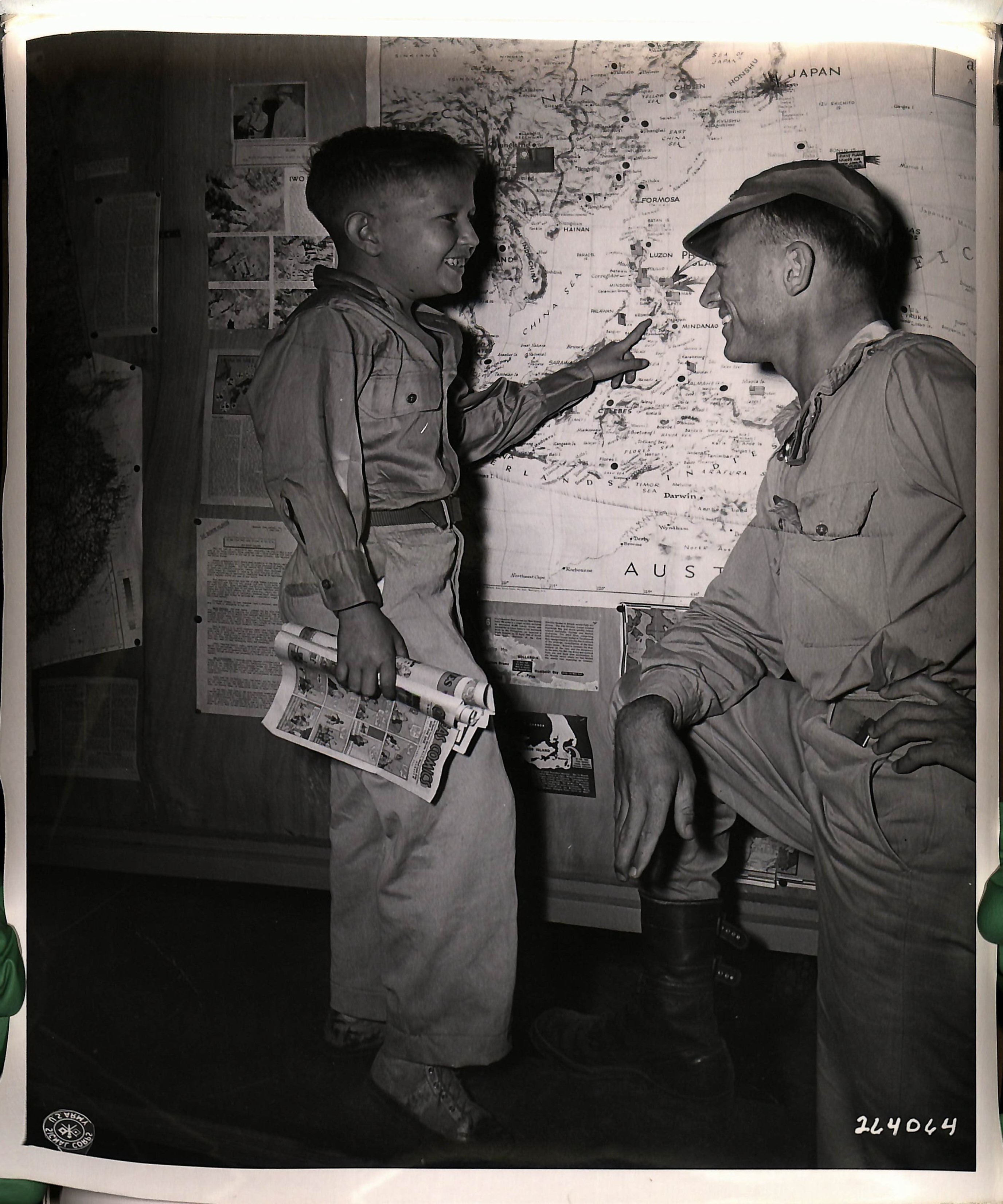 >Raymond Emerdge, tentatively identified as the son of an American officer, shows Major Will Wilson of Dallas, Texas, where he was held by the Japs for three years. He was picked up by guerrillas near I Corps Headquarters on Luzon, P. I.The face shows relief but the eyes show sadness.