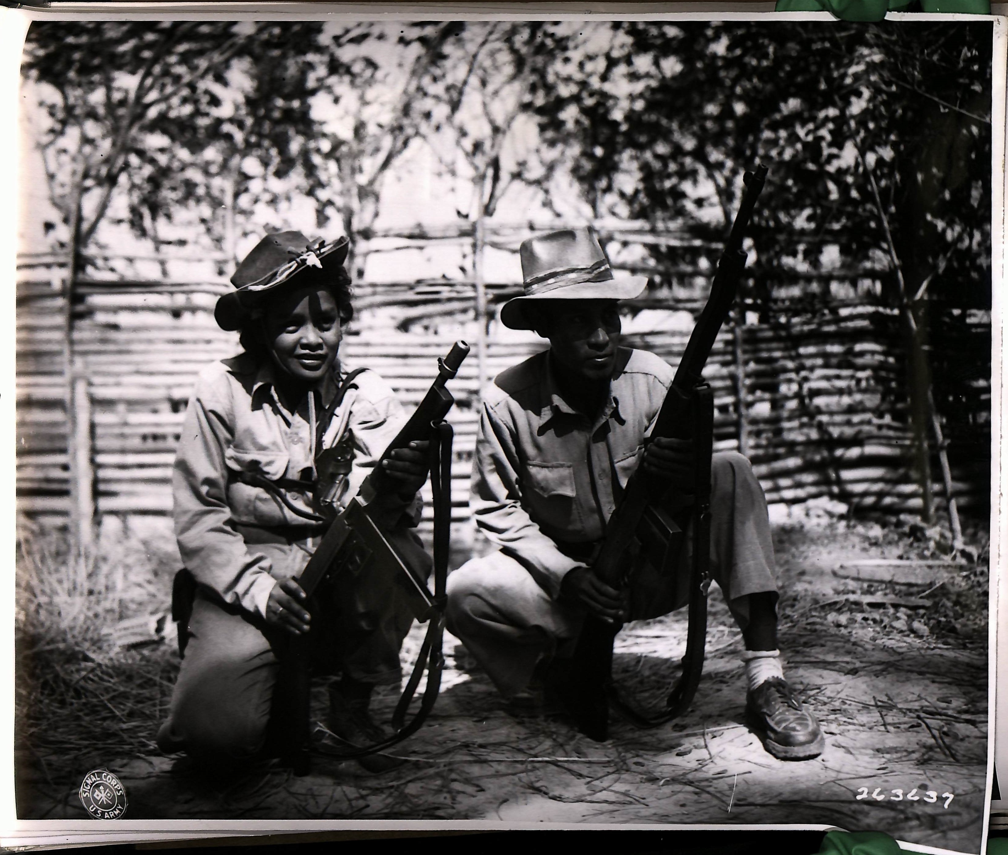 >Captain and Mrs. Alfredo Soniega. Formerly commanding officer of Squadron 268, of the Guer rillas, Capt. Soniega is now attached to a U.S. infantry regiment. Mrs. Soniega travels with her husband and helps him fight. P. I.GIWTWM