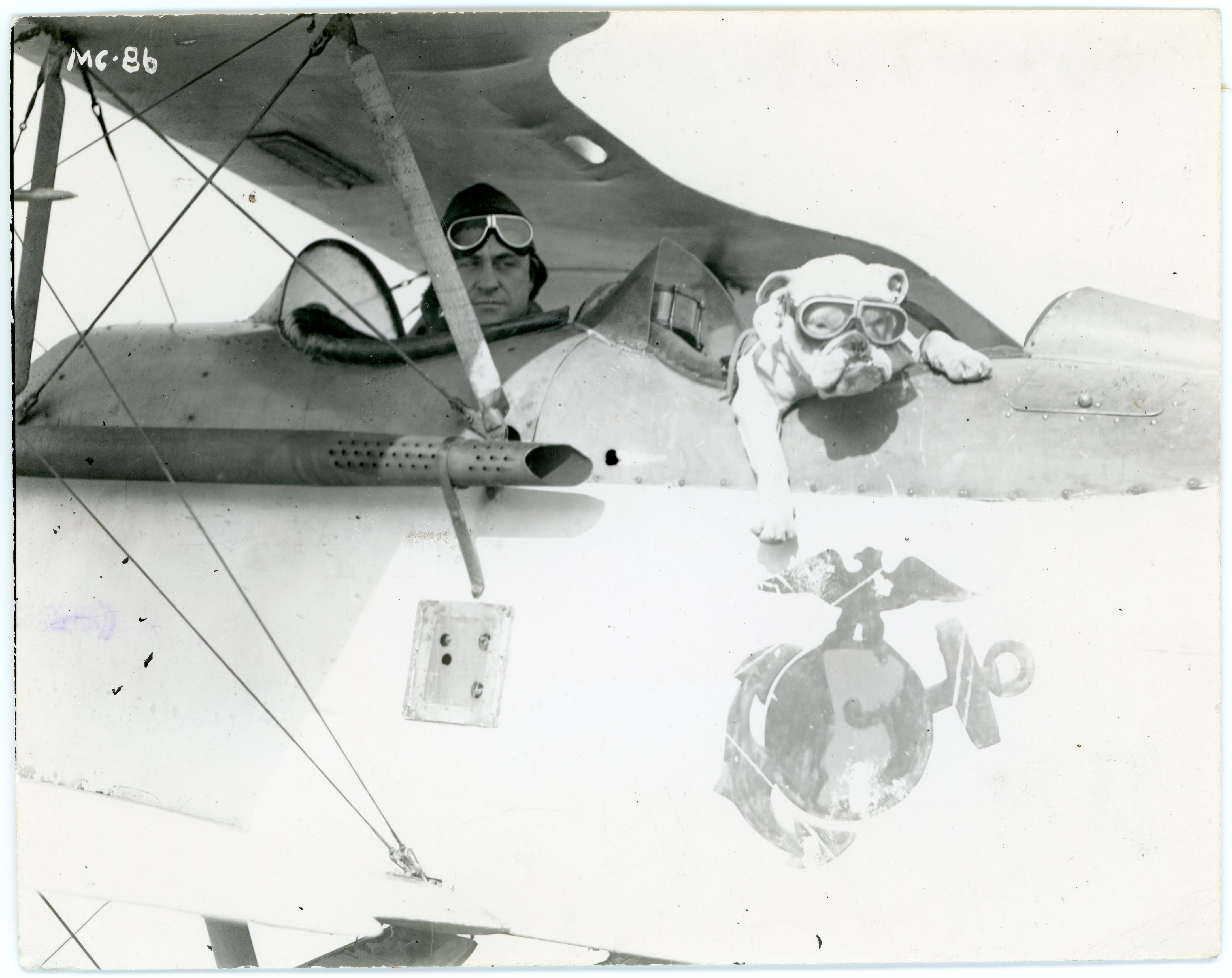 >Gunnery Sergeant Benjamin Belcher and Sergeant Jiggs, Mascot, in a Vought Training Plane at Quantico (1924)