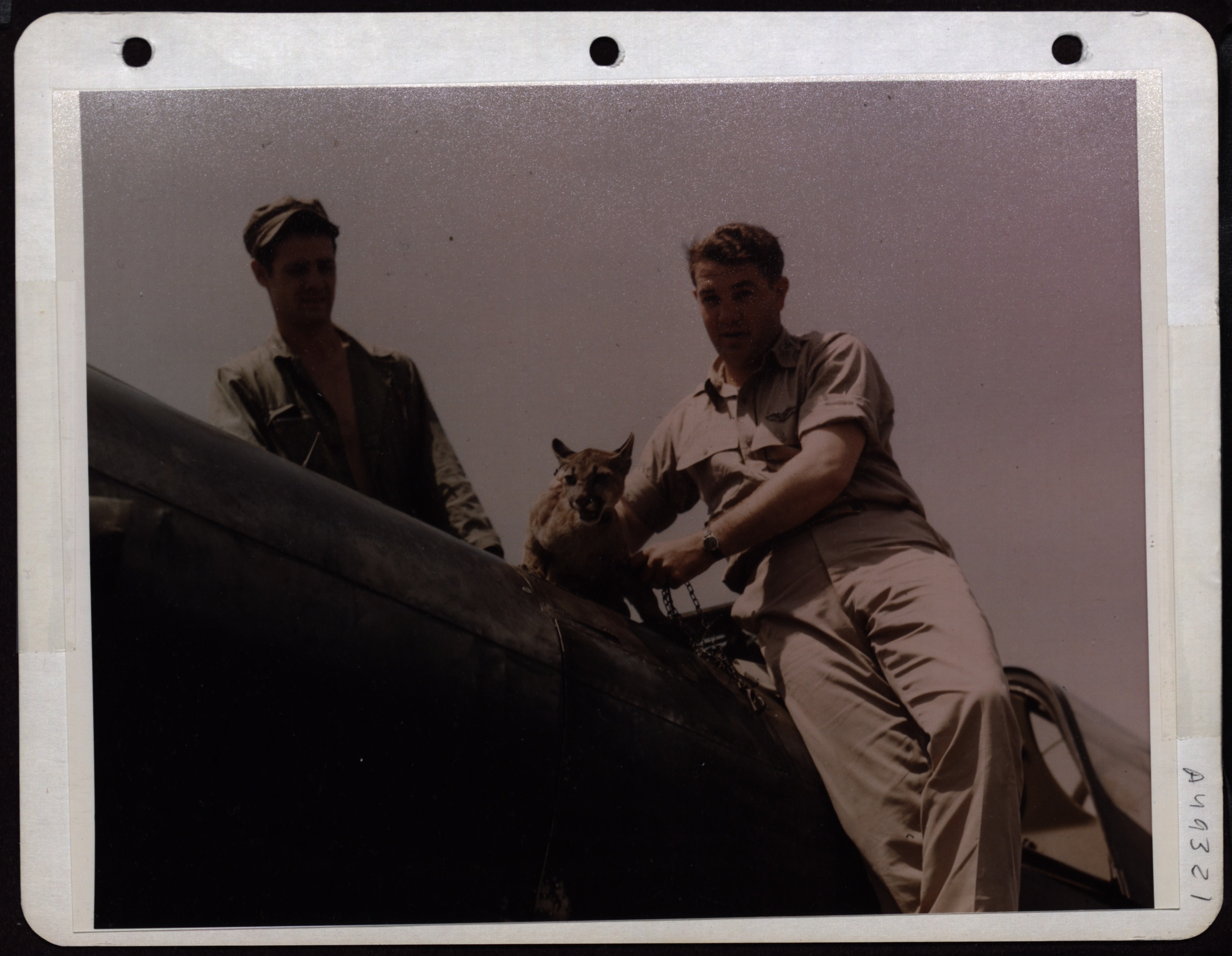 >Squadron Mascot - A Puma named Chetta with Pilot Lt. Joseph Slade and Cpl. Billy Papass standing by. Panama.