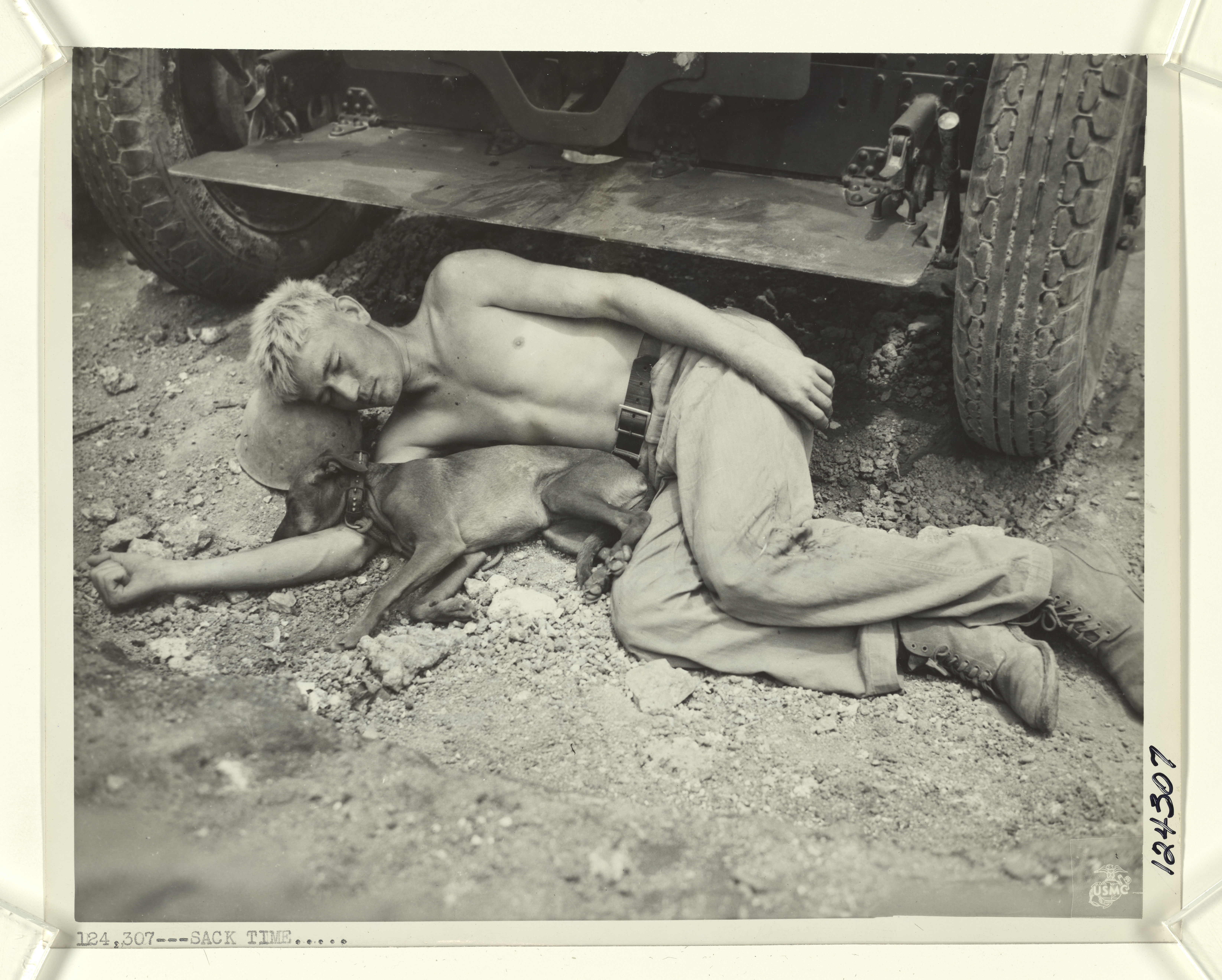 >Sack Time - With a steel helmet for a pillow and the coral ground for a bed, a Sixth Division Marine and "friend" take a well earned nap in front of a 105mm howitzer on Okinawa. The tired artilleryman is Private John W. Emmons, 210 20th Avenue, Sheffield, Alabama. His friend is the unit's mascot