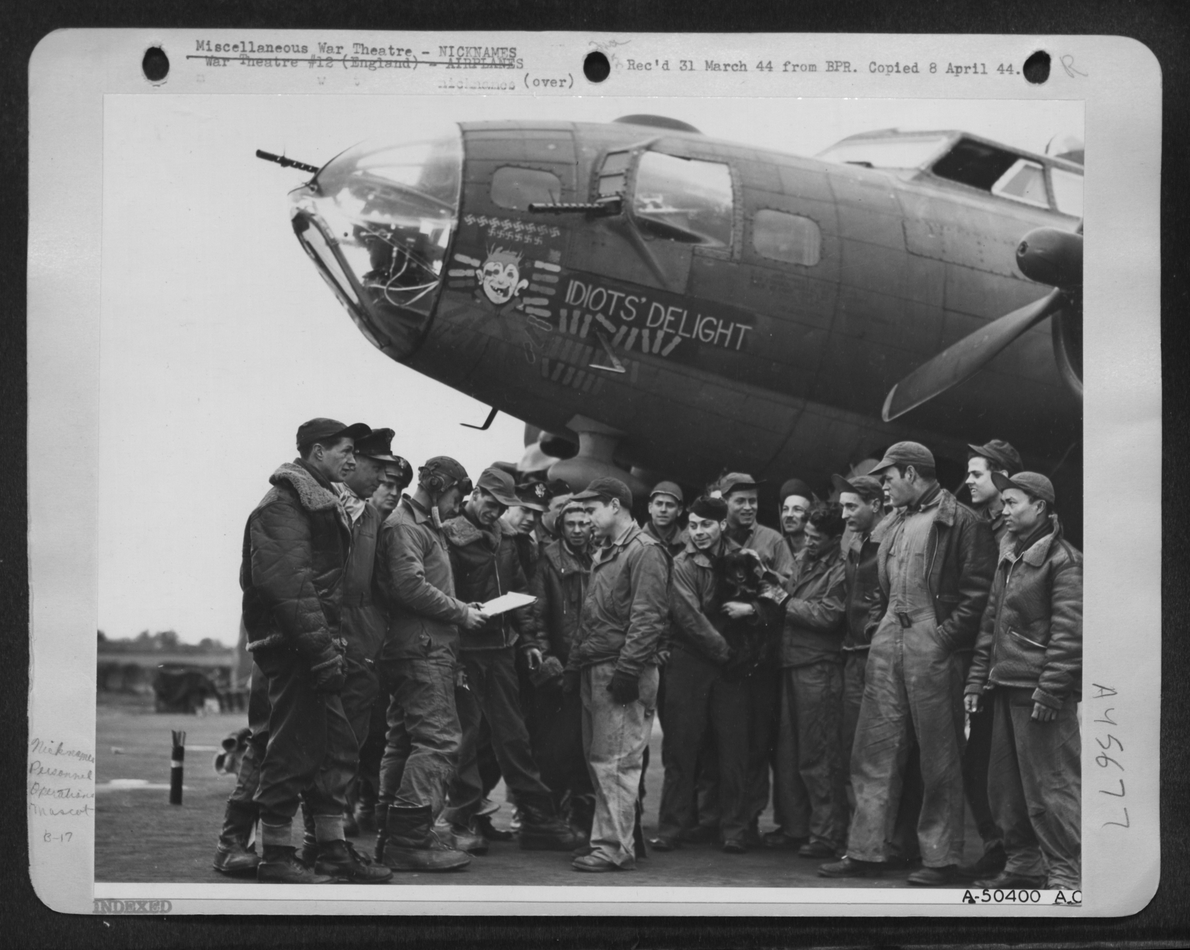>Flight and ground crew talking over the 50th mission under the nose of B-17 "Idiot's Delight" mascot "Flak Jr." is being held by one of the crew.Pilot 1st Lt. Austin E. Francis of Collinsville Ill. signs for as M/Sgt. Rensrose A. Bingman of Reading, Pa. crew chief looks on (center).