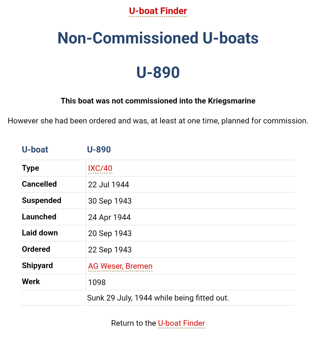 >>64781891Cock, i got cancelled too!U-boat U-891Type IXC/40Cancelled Suspended Launched 4 May 1944Laid down 11 Oct 1943Ordered 22 Sep 1943Shipyard AG Weser, BremenWerk 1099 Sunk during an air raid on 30 March, 1945 while being fitted out.