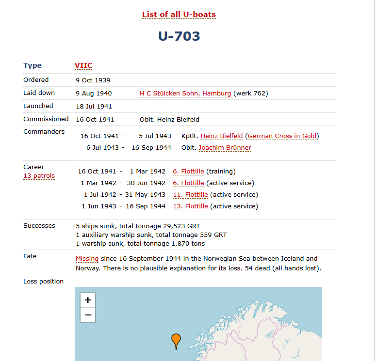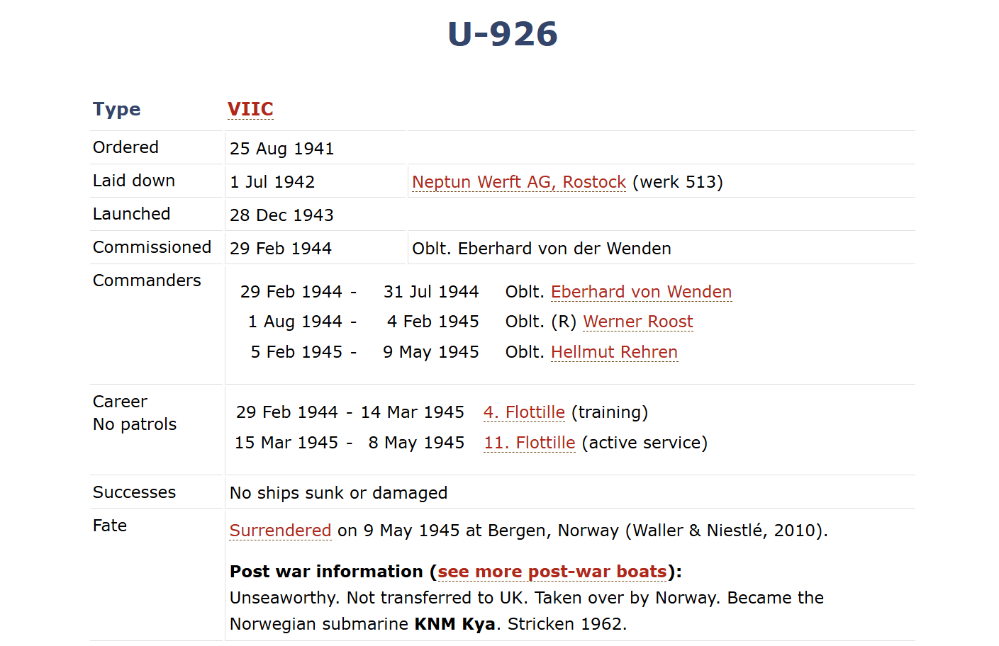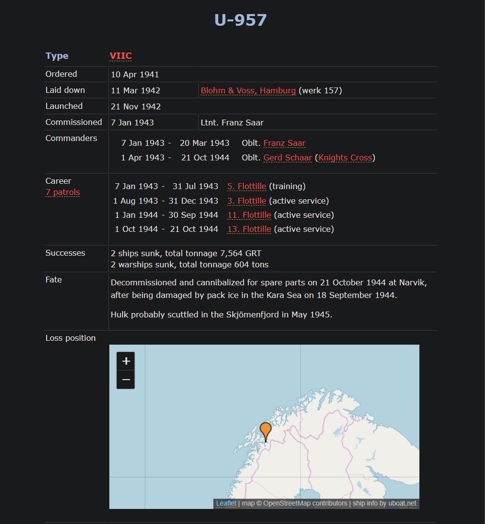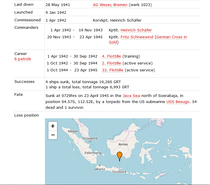 >>64781363Ordered 20 Jan 1941 Laid down 23 Dec 1941 Flensburger Schiffsbau-Ges, Flensburg (werk 482)Launched 17 Dec 1942 Commissioned 18 Mar 1943 Oblt. Wolf-Werner WilzerCommanders 18 Mar 1943 - 31 Aug 1943 Oblt. Wolf-Werner Wilzer1 Sep 1943 - 9 May 1945 Kptlt. Werner NeesCareer7 patrols 18 Mar 1943 - 31 May 1944 8. Flottille (training)1 Jun 1944 - 14 Sep 1944 11. Flottille (active service)15 Sep 1944 - 8 May 1945 13. Flottille (active service)Successes No ships sunk or damagedFate Surrendered on 9 May 1945 at Narvik, Norway (Waller & Niestlé, 2010).Transferred to Loch Eriboll, Scotland, on 19 May 1945 and later to Lisahally.Operation Deadlight (post-war Allied operation, info)Sunk on 31 Dec, 1945 in position 55.45N, 08.18W.