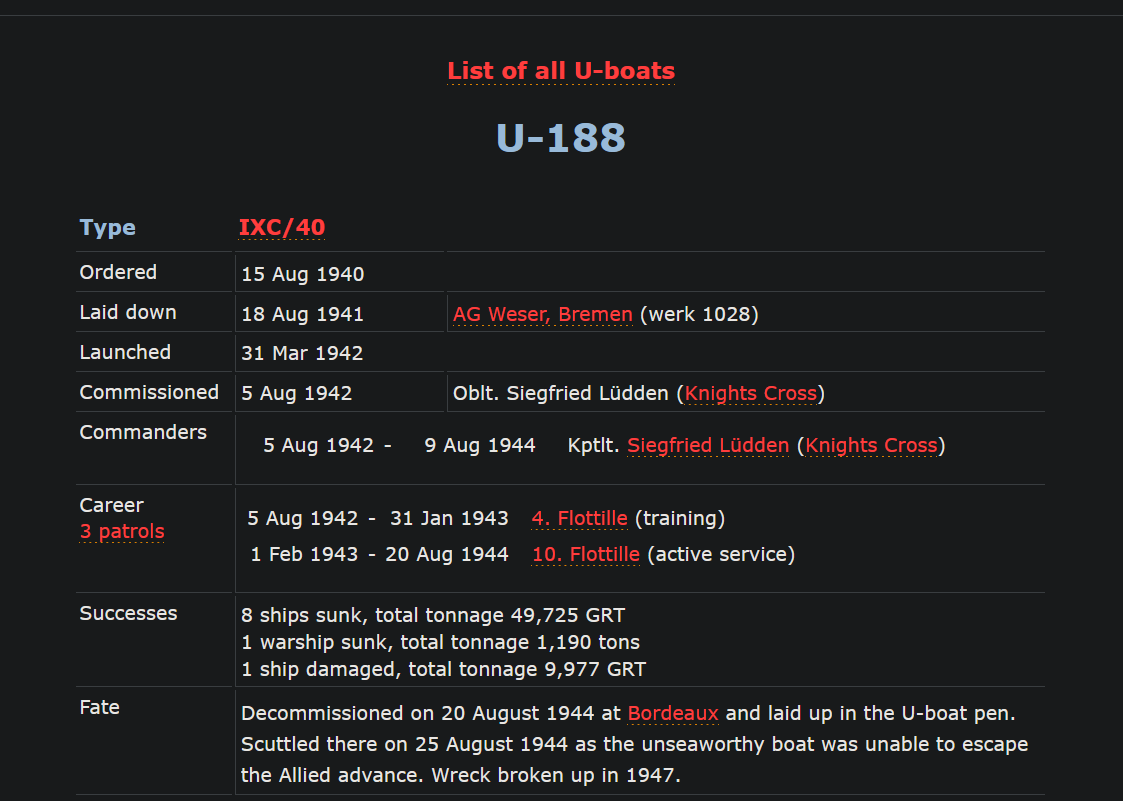 >>64780155Ordered 25 September 1939 Career 23 Aug 1941-5 May 1945Successes 25 ships sunk, total tonnage 126,664 GRT1 warship sunk, total tonnage 13,785 tons1 auxiliary warship damaged, total tonnage 6,736 GRTFate Surrendered on 5 May 1945 at Baring Bay near Frederica, DenmarkScuttled after war as part of Deadlight