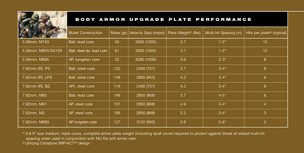 >>64782214>Dude all bullets are so small in caliber that at those caliber ranges you can’t hope to hit the same place twice anywaysIf you refer to the chart, you'll see that mere 7.62x39mm hard steel core needs 3-4" spacing between hits. Mind you, these are really top shelf Ceradyne plates. All Level III plates need at least 2" spacing between rounds of 7.62x51mm or they are NOT required to stop successive rounds. You can adjust shot spacing by the incorporation of a crack arrestor or using a thicker backer behind the plate for certain weaker threats like 7.62x51mm M80, which is outperformed by hard steel core 7.62x39mm - especially BZ API. This is really elementary stuff. You don't have to hit the same area, you just have to get close enough. If you hose the plate inevitably some will make it through. Pay special attention to that chart with how tungsten M995 is grossly inferior to steel 7.62x39mm BZ API. The slower fatter penetrator once again wins. That's not the case with all armor, but it is the case with this kind of ceramic plate.