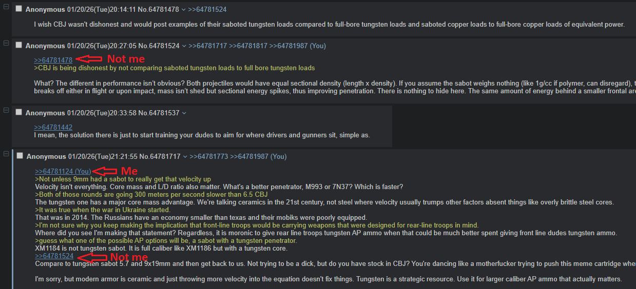 >>64781124>Not unless 9mm had a sabot to really get that velocity upVelocity isn't everything. Core mass and L/D ratio also matter. What's a better penetrator, M993 or 7N37? Which is faster?>Both of those rounds are going 300 meters per second slower than 6.5 CBJThe tungsten one has a major core mass advantage. We're talking ceramics in the 21st century, not steel where velocity usually trumps other factors absent things like overly brittle steel cores.>It was true when the war in Ukraine started.That was in 2014. The Russians have an economy smaller than texas and their mobiks were poorly equipped.>I'm not sure why you keep making the implication that front-line troops would be carrying weapons that were designed for rear-line troops in mind. Where did you see I'm making that statement? Regardless, it is moronic to give rear line troops tungsten AP ammo when that could be much better spent giving front line dudes tungsten ammo.>guess what one of the possible AP options will be, a sabot with a tungsten penetrator.XM1184 is not tungsten sabot. It is full caliber like XM1186 but with a tungsten core.>>64781524Compare to tungsten sabot 5.7 and 9x19mm and then get back to us. Not trying to be a dick, but do you have stock in CBJ? You're dancing like a motherfucker trying to push this meme cartridge when nobody has seriously adopted it in forever. I'm sorry, but modern armor is ceramic and just throwing more velocity into the equation doesn't fix things. Tungsten is a strategic resource. Use it for larger caliber AP ammo that actually matters.