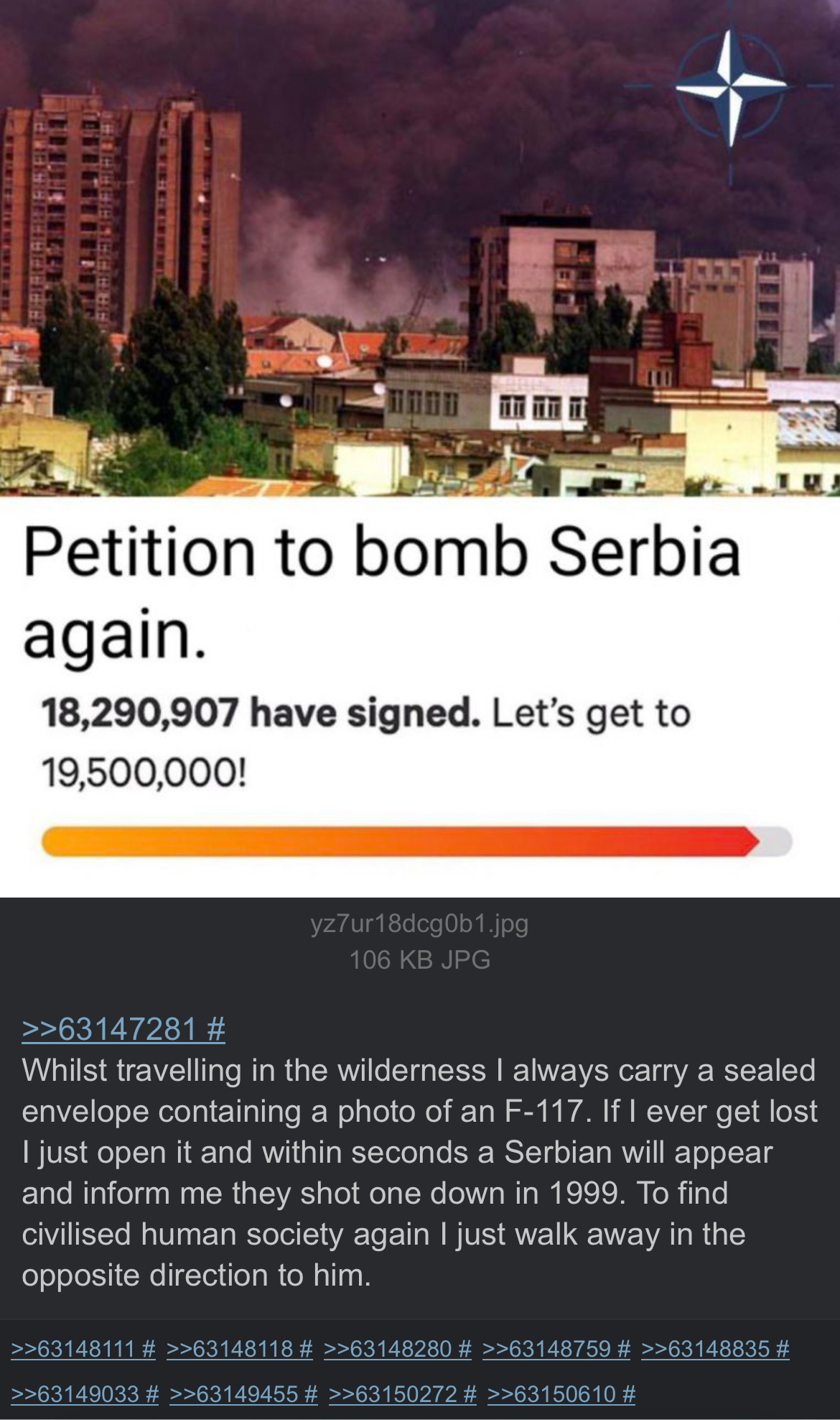 Whilst travelling in the wilderness I always carry a sealed envelope containing a photo of an F-117. If I ever get lost I just open it and within seconds a Serbian will appear and inform me they shot one down in 1999. To find civilised human society again I just walk away in the opposite direction to him.