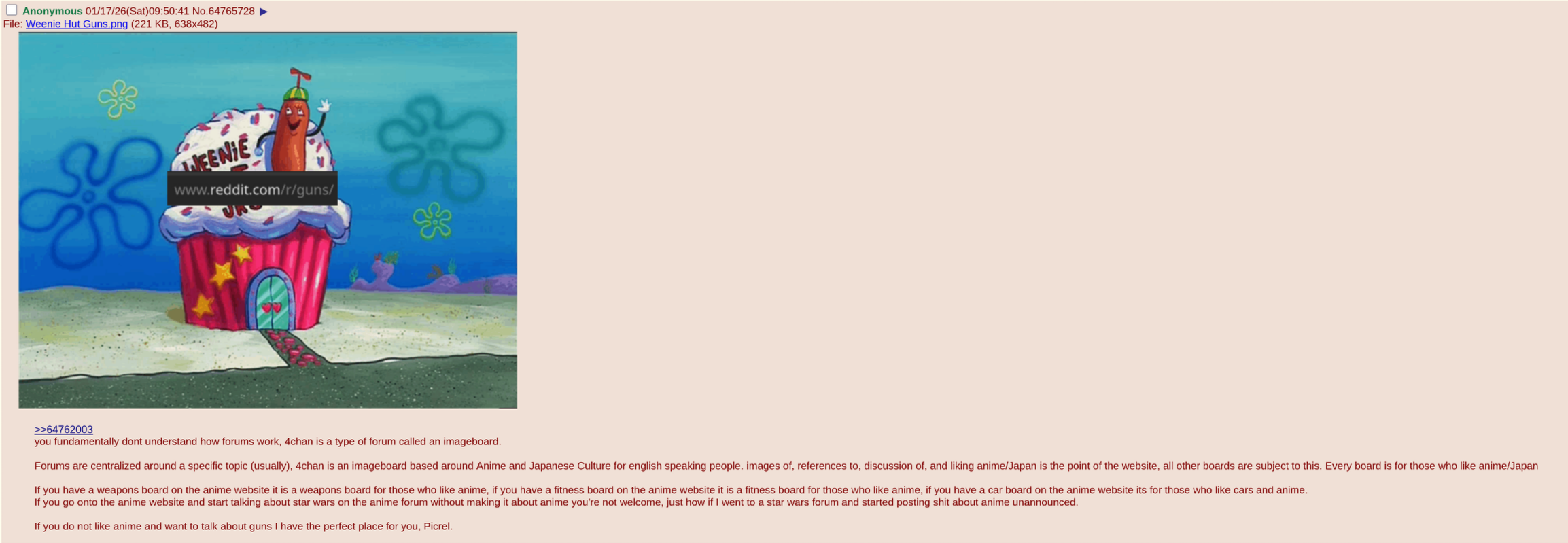 >>64844398/k/ is the weapons board. /b/ was the first board. Doesn't matter what other forums Moot set the site out to emulate.Therefore, not an anime site. Get your shit together ya goober.