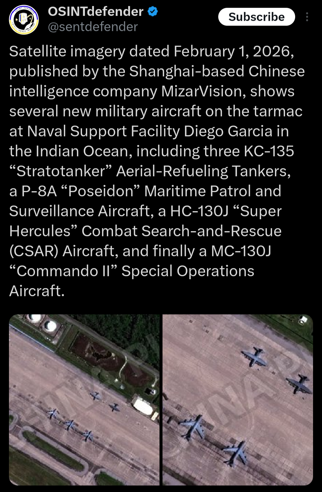 >Satellite imagery dated February 1, 2026, published by the Shanghai-based Chinese intelligence company MizarVision, shows several new military aircraft on the tarmac at Naval Support Facility Diego Garcia in the Indian Ocean, including three KC-135 “Stratotanker” Aerial-Refueling Tankers, a P-8A “Poseidon” Maritime Patrol and Surveillance Aircraft, a HC-130J “Super Hercules” Combat Search-and-Rescue (CSAR) Aircraft, and finally a MC-130J “Commando II” Special Operations AircraftOperation Eagle Claw 2.0?:https://x.com/i/status/2018518272615108983