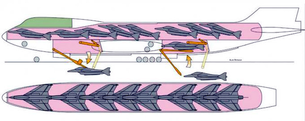 >>64836293You can't just make bomb bays with hatches, they will cut through structural frames and stringers and it will fall apart.See project of the B-747 bomber >>64836811They had single small hatch in the back to launch missiles and rail racks to move missile drums to that hatch.You can make specially made fuselage with hatches incorporated utilizing other parts of aircraft (wings, engine etc) see Beluga aircraft but it's not that simple as just take existing craft and put bombs inside.