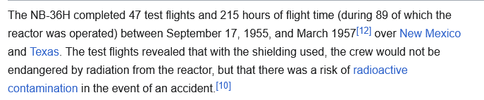 >>64835720Most of the B-52s we lost went down in our own country or that of an ally. Due to accidents or airframe failures. Nuclear propulsion just means dropping a bunch of fallout on ourselves.