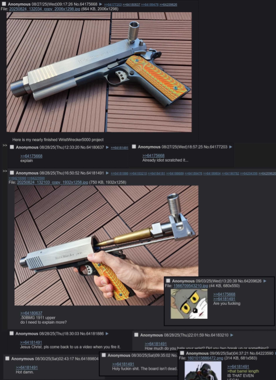 https://youtu.be/hZ1orxXV2GsI wonder what anon is planning next after the 50bmg 1911 and the dildo suppressors
