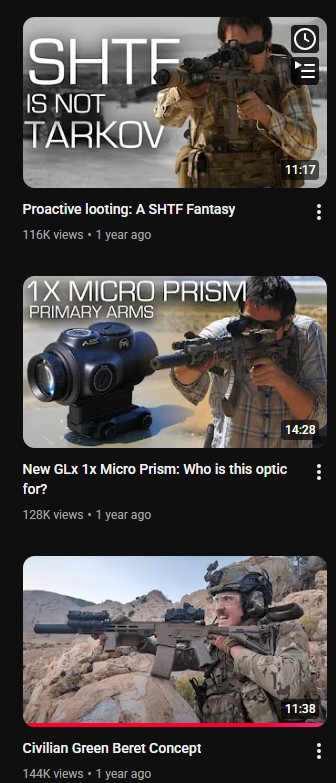 >>64864385My reqs - High req:>Grunt Proof (like Brent0331)>Charlie Coks (Yeah yeah, was with GarandSeed but after the shit Mr. Flannel pulled Charlie has completely severed himself from him [shits on him subtlely with Micah]. Makes good pistol comp and now precision shooting videos.)>The Hidesite (Current US Army sniper, dope shit on concealment and precision shooting (gas/bolt)>Modern Tactical Shooting (Definitely watch this guy, Green beret who did shit in early GWOT. Lots of good knowledge)>Falcon Claw (Estonian soldiers that make thermal/NV content, really cool dudes imo and videos are fun to watch)>deltathirtyfour (God bless this man, he is an acog shill in the best kind of way)>Minutemen Initiative (Alaska bros that have a podcast on a whooooole bunch of good shit. Both veterans)Mid req:>Micah Mayfield (not really serious, but if just like watching guns you'll never buy get shot and need a filler video when you're doing something its good background noise)>Basecamp (New, has some goodies)>Brass Facts Sphere (TFB, Nova Group, and Hop fall within the Brass Facts sphere. I enjoy their content, no operator slop just purely gun/gear/prepper [not gay fantasy level] videos.)>Lightfighters Anonymous (He is a friend of Brent0331, good stuff)>Regular Guy Training LLC (Like Brass Facts but simpler presentation and no prepper talk)You're bored req:>FocusTripp (He primarily reports on the gun industry and eceleb turd shit but if you want to keep up with the joneses he is your guy)>GWOT Alchemist (Focuses on the civilian preparedness stuff, Marine vet that yaps)>Concrete Cowboy (He's alright, doesnt really tread new ground)>PNW_Guerrilla (Similar to GWOT Alchemist but all his videos are outside, not in a spare room)>Soteria Security Group ( Civilian channel and it shows, new channel and I'm looking forward to seeing this guy mature and not be 100% retarded)>StatTAC (Preppertube, kind of cool, veteran brothers run the channel and its alright)