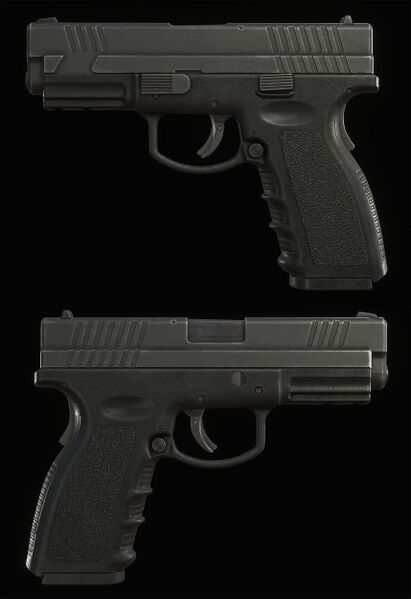 Closest would be a mid-first-generation HS2000 or early XD, after they added the grip texture panel to the side and the front serrations I should think. But you're going for an autistic vidya clone, it won't be good enough for you