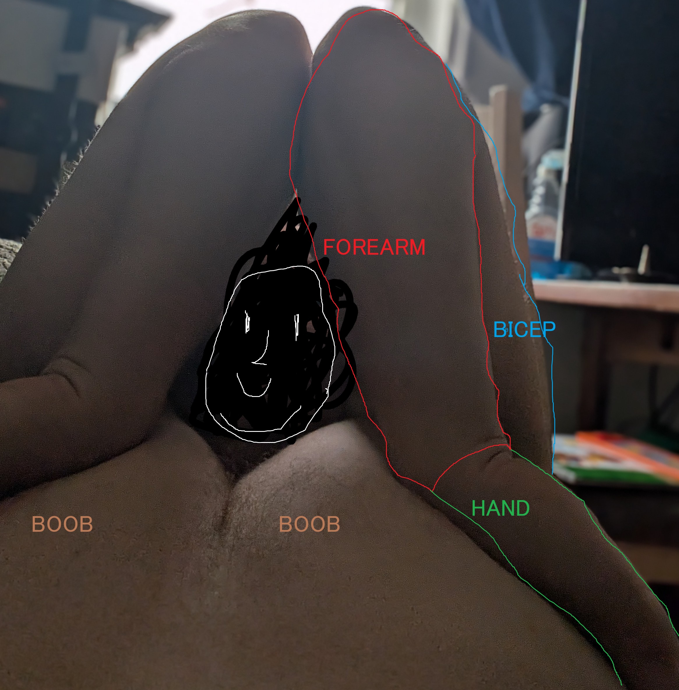 >>64872358Ok I got it. This creature rotated his elbows inward to the point of popping out or almost popping out his shoulders from their sockets so his elbows could touch but the opposite way the connecting limbs are his forearms, that is his ass. He took the pic with his feet (with opposable thumbs on feet) and the censored part his is dick