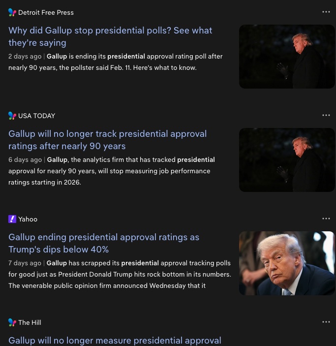 >>64881048>Remember that the major polling orgs have simply stopped publishing approval ratings>he's forcing researchers to stop asking....why would you lie about something so blatantly and obviously false? Are you retarded?