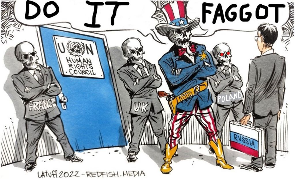 >>64881140>that image from one of those chink propaganda pieces they think make Americans look badIt's a Russian strip. Iirc the peaceful Russian bear is holding a briefcase (of humanitarian aid? I forget) trying to enter a door labeled....something good, I think....and evil Uncle Skull is blocking his way.