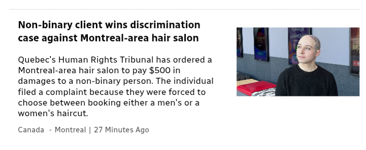 >>64884115Kek, failed nation.He wasnt even denied service, didnt even step foot in the business, just sued them for only having 2 genders on their online form.>they didn't realize trying to book an appointment at a Montreal-area salon would lead them to a years-long legal challenge.>It all started in 2023, when Migneault went to book an appointment for a haircut at the Station10 hair salon.>cheaper when booking in advance and the only way to do that is by filling out an online form.>the form forced Migneault to specify whether the service was for a man or a woman.>Choose whichever' is something that is said a lot to non-binary people but it’s extremely tricky for us to do that," Migneault explained>Migneault decided to take their case to Quebec's Human Rights and Youth Rights Commission>the salon offered Migneault three free haircuts and changed its website to include a non-gendered option.>the CDPDJ determined Migneault was the victim of discrimination and recommended the salon pay $500 to the plaintiff to avoid the risk of being sued, but the salon refused>After the salon refused to pay the damages, Migneault went above the commission to Quebec's Human Rights Tribunal, calling for more than $12,000 in emotional and material damages. They alleged the battle over the hair appointment contributed to the mental health issues they later faced, forcing them to go on sick leave at work.JesusFucking love guns tho.