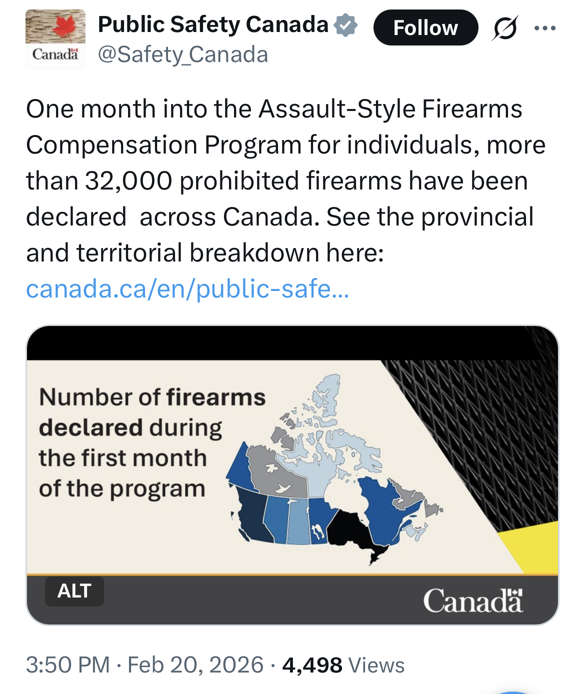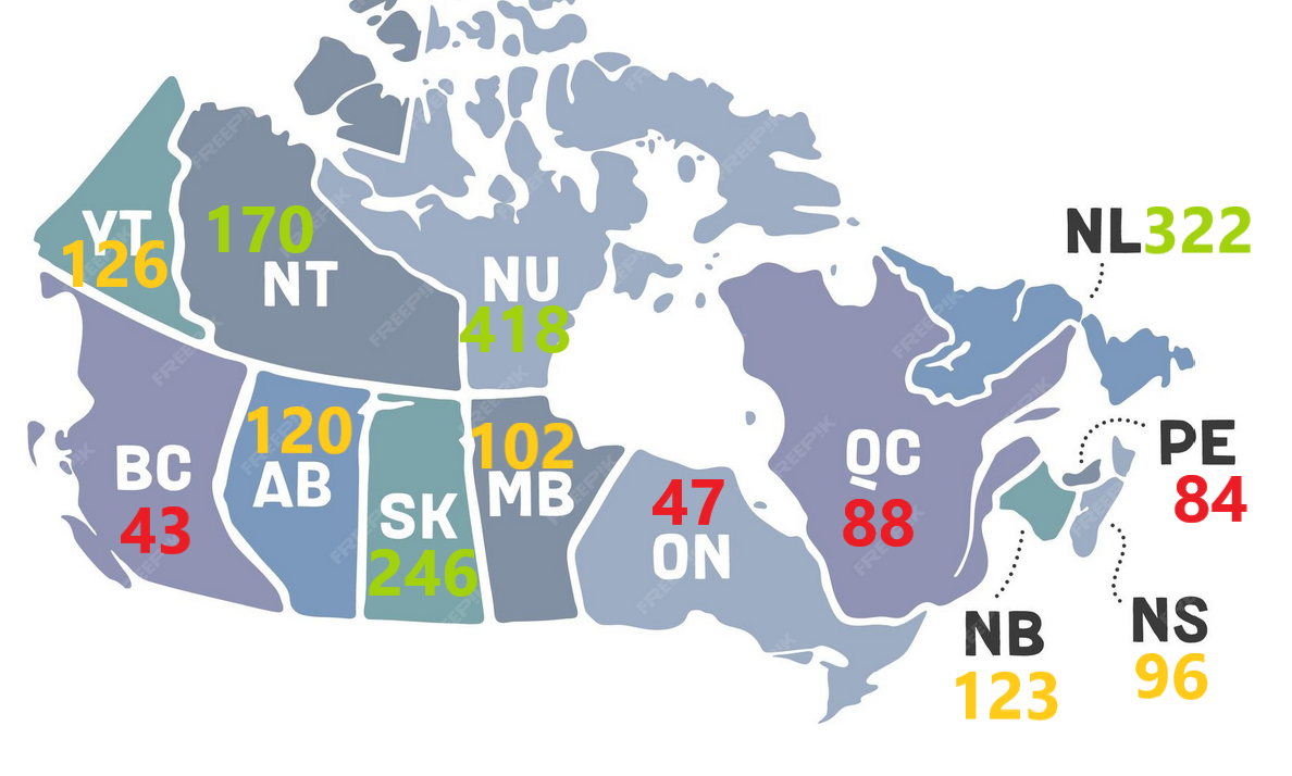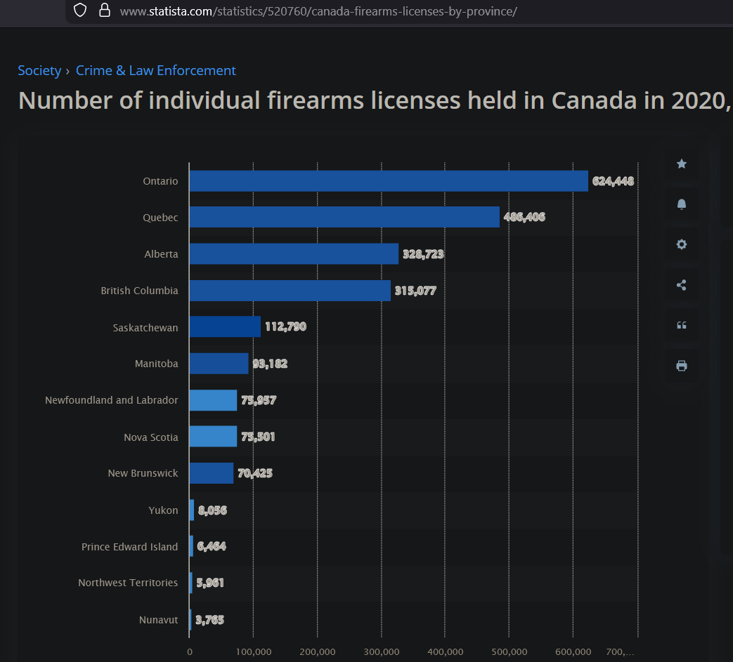 >>64887541I'd wager correlation on some of the extremes;The territories are 'old gun' areas. Alot of hand-me-down hunting guns.On the other end BC & Ontario may be more 'new gun' areas, lots of nupals who want kewl guns. though the correlation is weaker on this end.