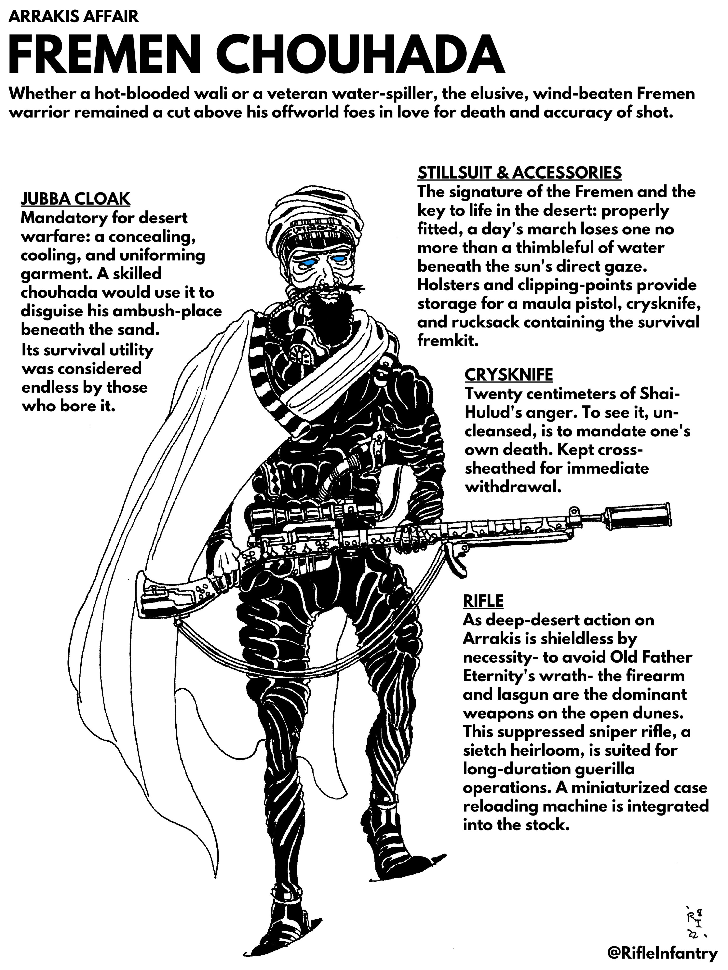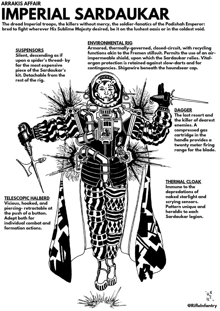 it is the Atreides who are the real elite warriors, and they came from a similarly-poor background but not dogshit poor like the Fremen; the Atreides were a major Great House and the leader of the Landsraad political opposition, with all the technological and tactical superiority that this affords: the best Mentat and the best Swordmaster in the galaxy, and access to all the best technology even if only in small amounts