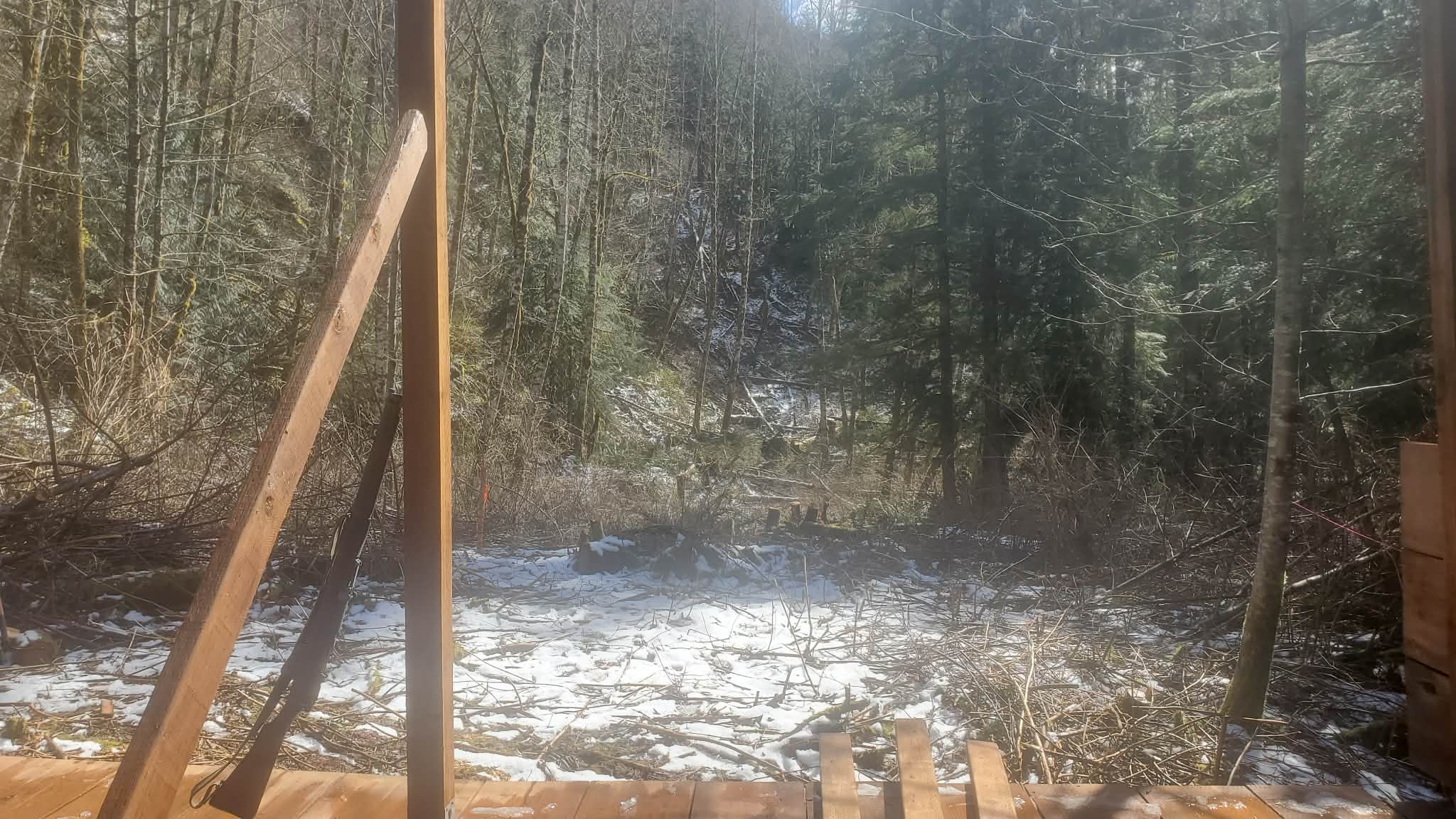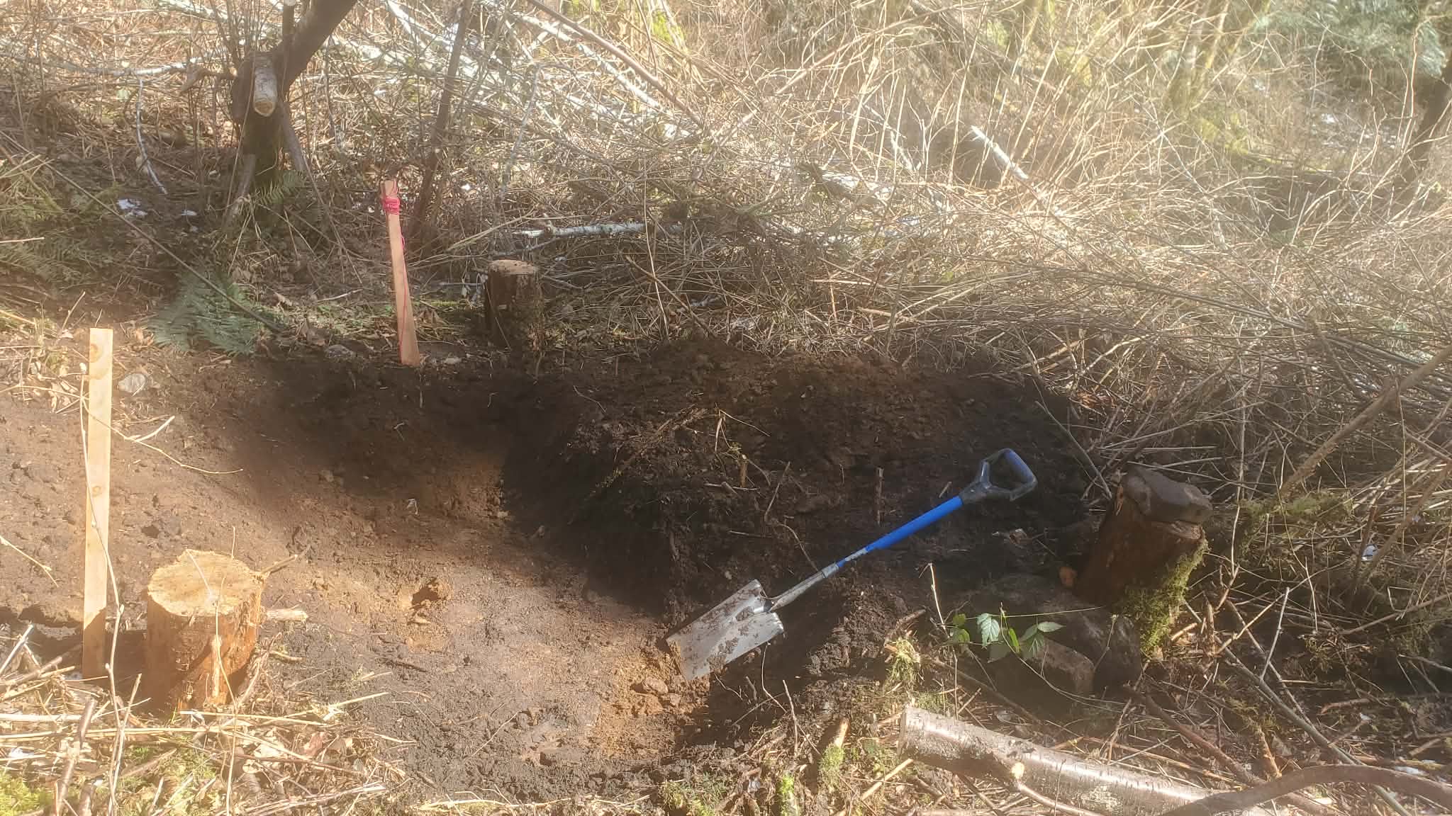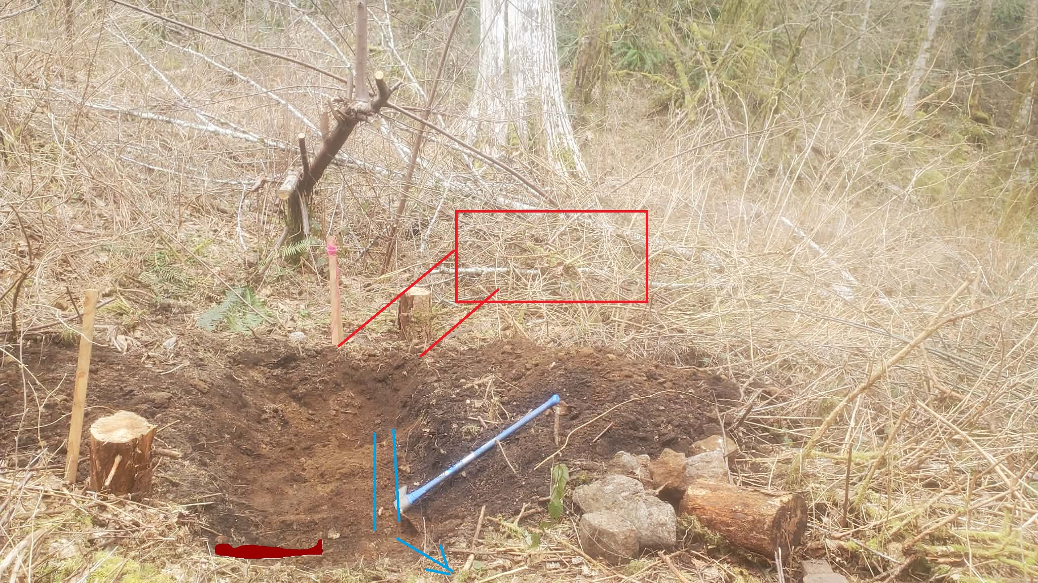 So heres a quick sketch from a pic from today. The red box is where the MG nest/pillbox will go, the trench needs to still be dug along the red line route to its spot near that tree. Blue will be drainage direction