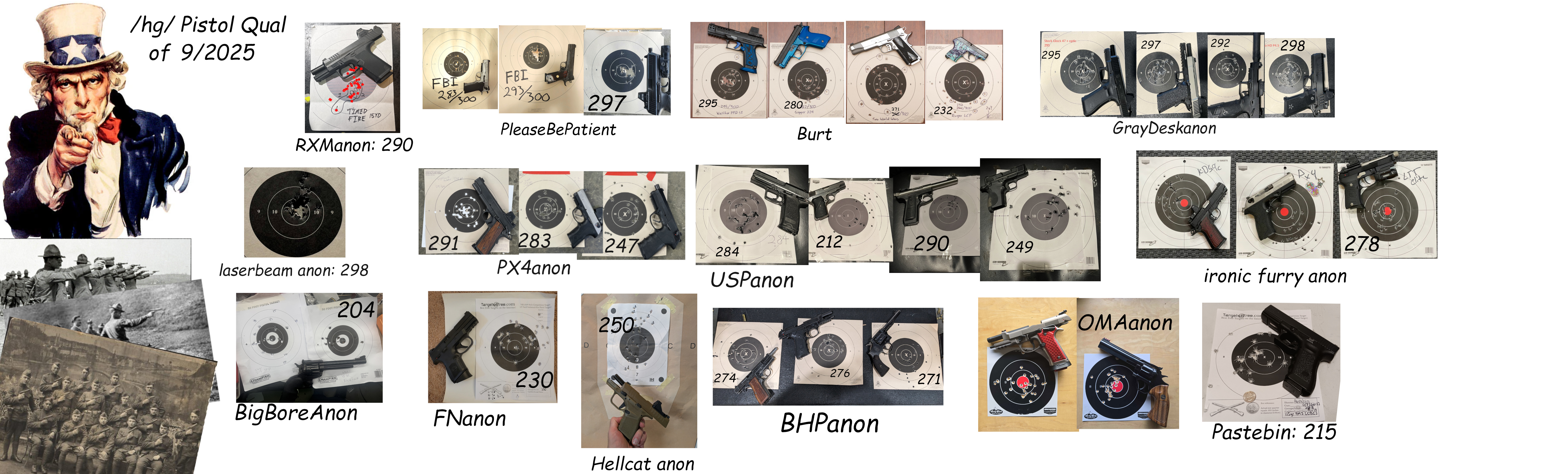 >>64944796This old one was 10 shots at 252 strings of 5 rounds at 15 in 15 seconds 2 strings of 5 rounds at 15 in 10 seconds Easy, but very hard to score 300/300 >>64943798Done on a NRA B8 or B8C.