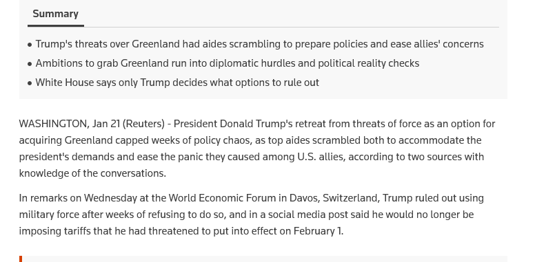 >>64944141His aides had to literally dissuade him of it. https://www.reuters.com/world/europe/trump-reversal-greenland-followed-push-by-aides-against-military-option-sources-2026-01-22/>>64944150Trump shows no sign of long term strategic thinking. He seems bored easily, and primarily driven by narcissistic impulses. He really likes being seen as a heroic war-time President, and keeps trying to replicate the famous Obama picture when Bin Laden was killed. he's still trying to one-up Obama. He receives huge amounts of narcissistic supply from Putin and from Netanyahu, and feels he's among equals with them. Netanyahu knows how to manipulate Trump.