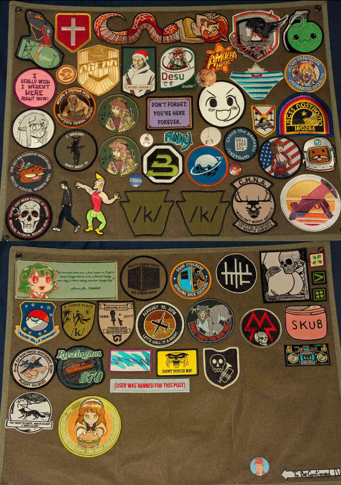 >>64947793Where'd you cop the "alcoholic cougar" patch? I've seen the one from woodpatch, but this one is really noice.