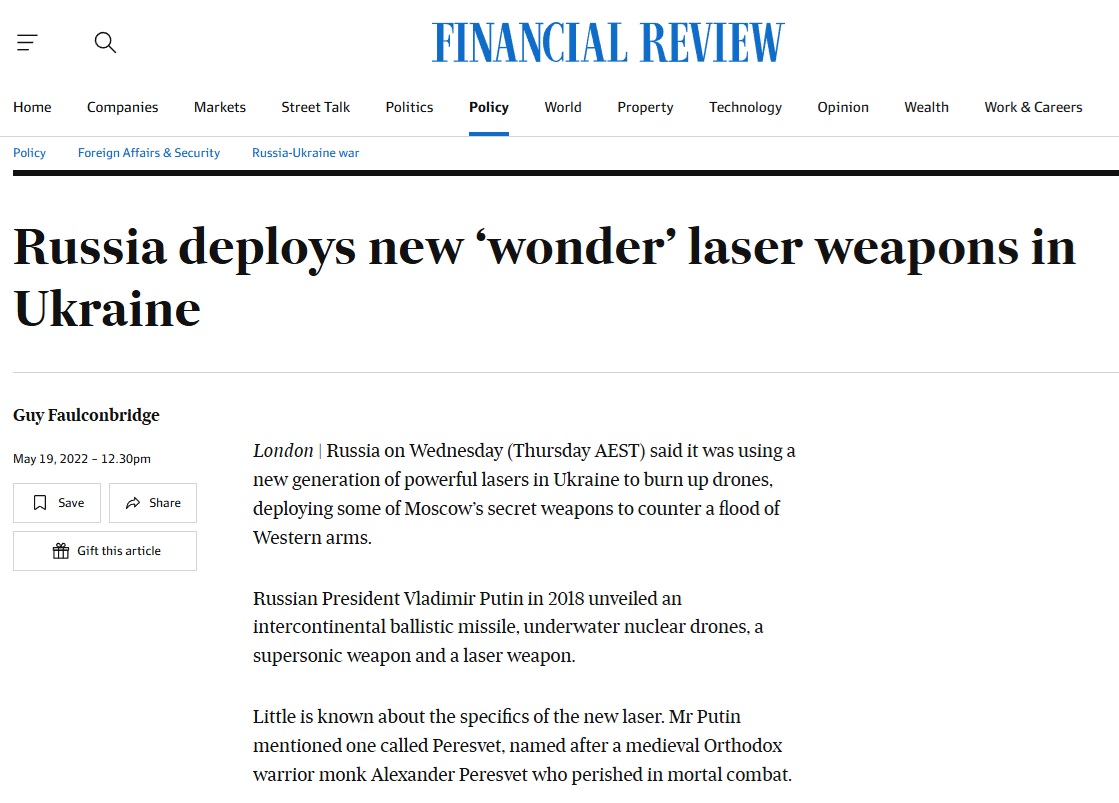 And of course there's that UN convention banning laser weapons, but Russians have been blowing up civilians for four years and the UN doesn't seem to give a shit, so I wouldn't expect them to do anything about this either. Hell, I don't see why terrorists couldn't do this regularly in random cities.