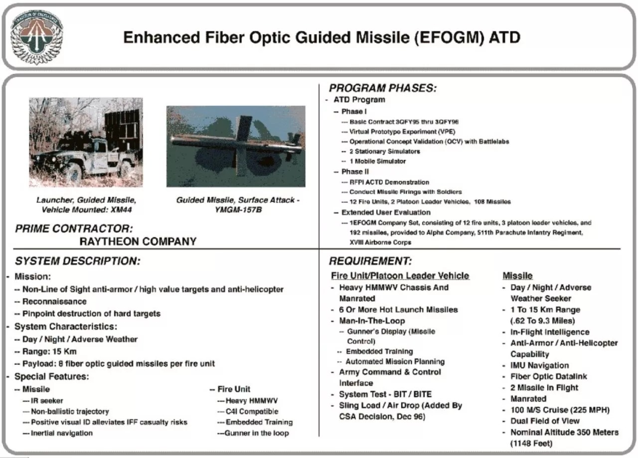 >>64955453>>64955636>>64955655>The Multimode Airframe Technology Program is concluding with a planned September 1998 sled test and December 1999 flight test. This program has demonstrated the technology required to fly a man-in-the-loop missile paying out fiber cable to a range of 40-km. The program objectives were to investigate the technology required for ranges in excess of 100-km. Critical is the data link subsystem that includes the fiber bobbin and the electronics to digitize and pass video and autopilot data up and down the fiber cable. The electronics have proven to be better than expected and can easily achieve 100-km. A preliminary design for a longer range fiber bobbin and fiber cable has been developed using analytical models. Based on the success of the 40-km payouts already accomplished under MAT, the design is not viewed as high risk.