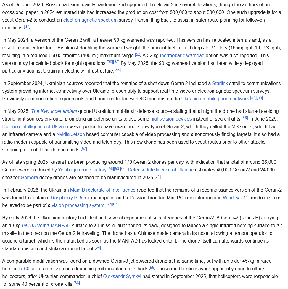 >>64963409>End of the Cold WarAs an aside, I know this is the case but why did the end of the cold war lead to the US to shifting towards low volume, bespoke weapon systems instead of low cost ones? Naively I'd expect the opposite and I'd like to know if you have any insight on the reason here.>>64963409>cruise missiles in enough numbersConsidering the main advantage of the shaheds, I'd go with this. Hell the US only makes ~1000 tomahawks per year, can't find any info on shahed production but russia makes ~400 geran 2s per day.>Because Iran cares more about throwing explosives whether it hits an important target or not.I don't think this is how iran uses the shahed, considering who iran has been planning to fight I think the idea with the shahed is to have an easily mass manufacturable weapon they can use to overwhelm their enemies defense system in massive swarm attacks.>>64963418Thanks for giving some insight into the history and design of LUCAS. Interesting to learn it evolved out of a target dummy program.