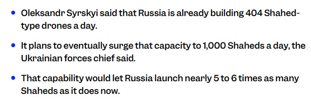 >>64963750According to this article it is specifically 400 gerans per day https://www.businessinsider.com/ukraine-oleksandr-syrskyi-russia-1000-shahed-per-day-2026-1