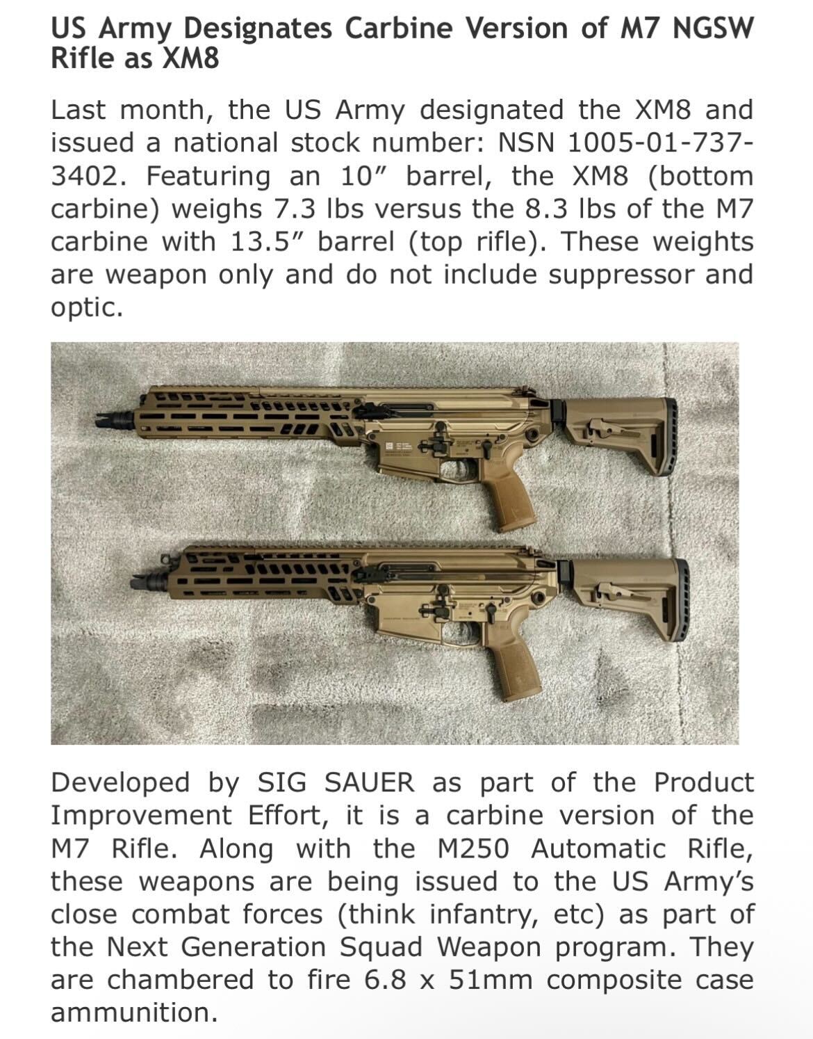 in case nobody here has heard it, there's a joke going around where the new sig spear is proof that the army ordinance department can't actually specify anything but an m14.The joke goes like this. in 1945, the army ordinance department set about on a boondoggle to build the ultimate infantry combat rifle system, at the time 'spiw' or 'special purpose infantry weapon'. They considered and decided against the best rifles in the world, many of which would surpass all their expectations in other countries armies, and at the end, they settled upon a caliber conversion of the previous rifle system they had been issued, with a box magazine upgrade, and a failed attempt at full auto, which they quickly deactivated once it became clear that it was not only useless, but damaging to the guns.once again, we are at the tail end ofa multi decade infantry ordinance program that has considered and decided against better more proven options in favor of a caliber conversion of the previous service rifle, which is worse than useless in full auto.