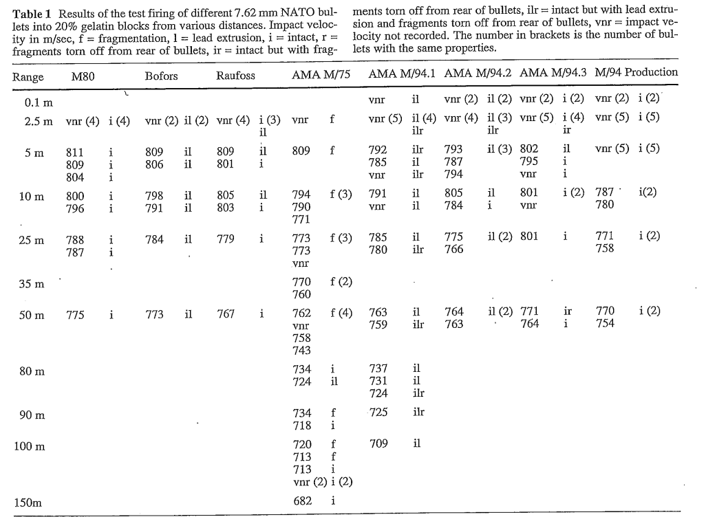 >>64988630And just as a further aside, the definitions they use here for fragmentation vs extrusion are a little hazy:No definition is provided for fragmentation at all, but based on the pictures I take it to mean that the jacket of the bullet breaks and the comes into pieces such that identifying which one should rightly be called the bullet anymore is a little meaningless.They define lead extrusion as the bullet losing more than 0.5g of mass (about 5% for these bullets), but presumably not qualifying as "fragmented" in that the jacket is largely intact and there is still a clearly identifiable single bullet. They don't list the amount of mass not retained for most of the bullets and velocities.This is interesting mostly because most of the il and ilr the amount of mass being lost would probably qualify as light or partial fragmentation for the purposes of assessing terminal ballistics. Certainly even just from the diagrams, the il and ilr tests appear to produce temporary and permanent wound cavities that are nearly twice the maximum width of the intact M80 at similar or lower velocities, penetrating to only about 70-80% the depth but with similar or greater total wound volume.Basically, M80 probably kind of sucks compared to other general purpose 30 cal. I wonder if M80A1 fixed it.Final thing, probably the funniest bit: The study was being done to try and eliminate all fragmentation and minimise extrusion, because Europeans are utterly allergic to having effective militaries to such an extent that they'll purposefully misinterpret rules about bullet design to force themselves into make their bullets work worse.
