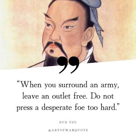 >>64982278Sun Tzu's guidance (and many chinese proverbs) are intended to be applied figuratively as well as literallyoffering surrender terms is the most common example of this principle, anonthere are practical reasons (as well as ethical) to give the enemy quarter in modern warfare