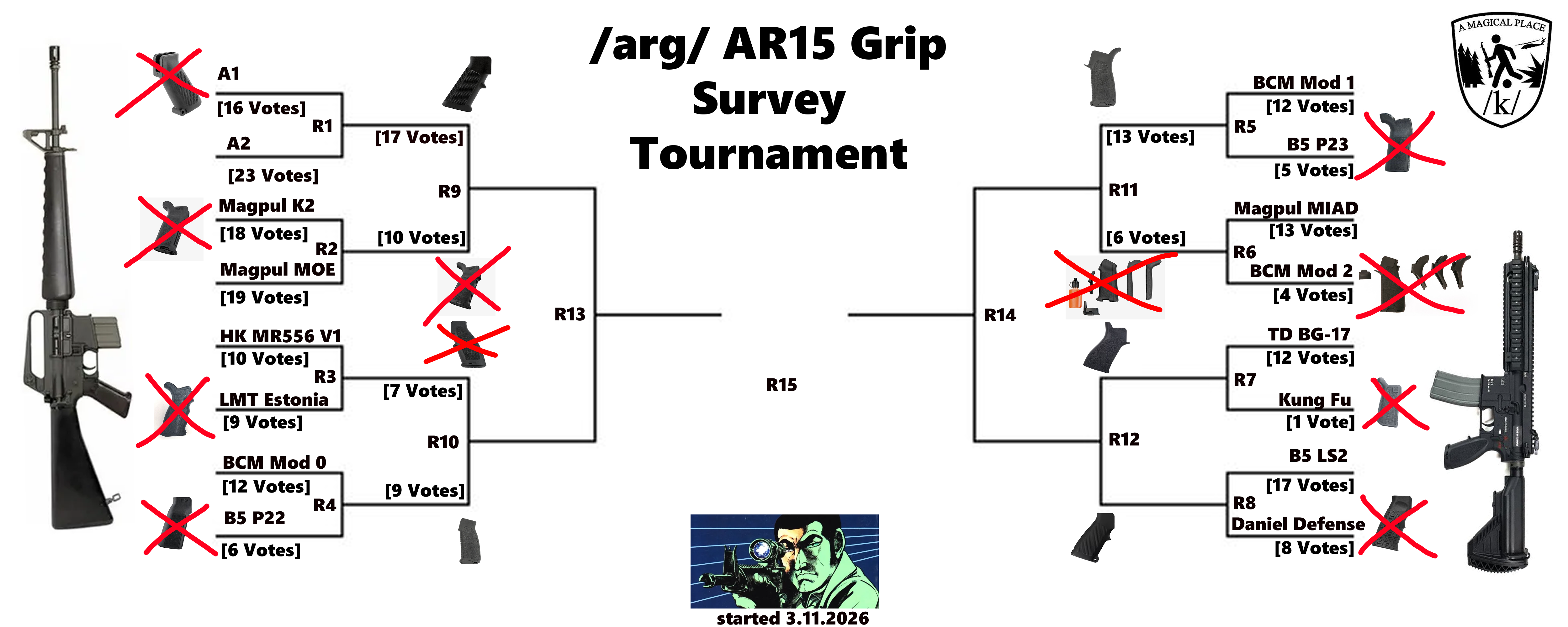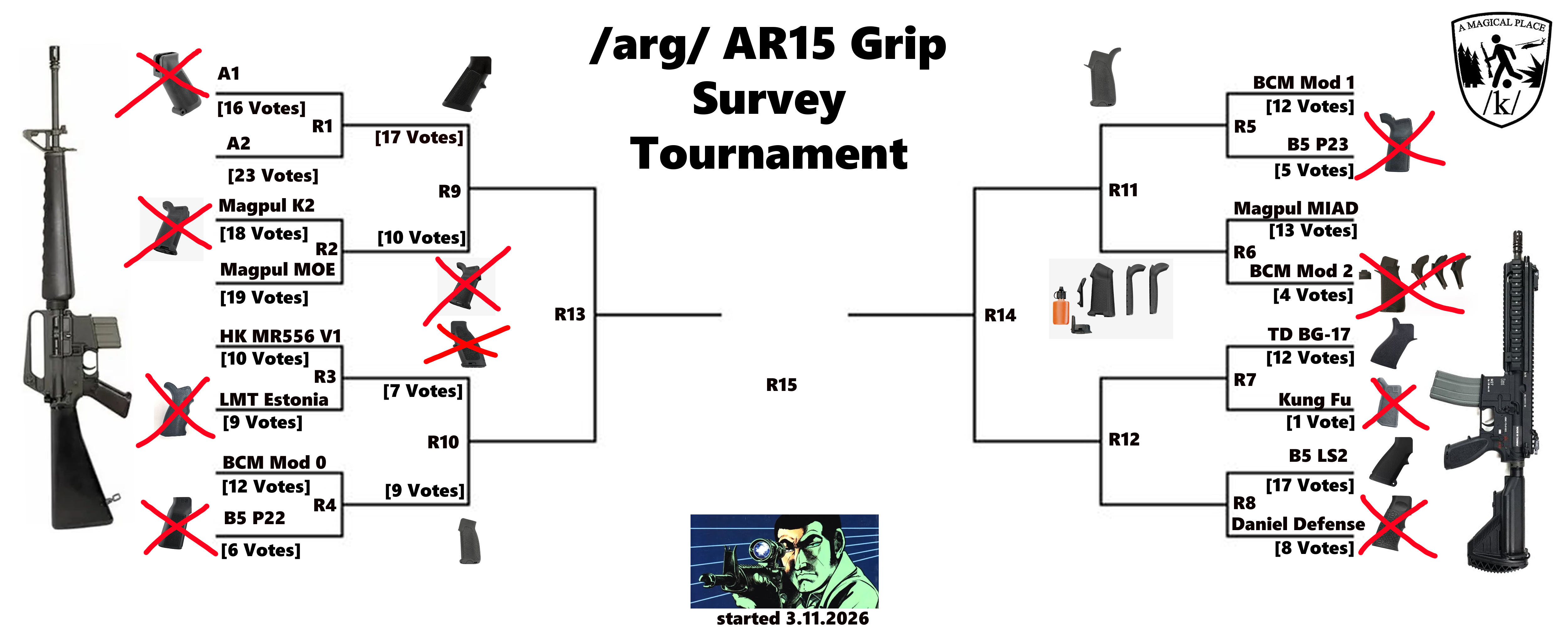 >>64992391>>64997990/arg/ AR15 Grip Survey TournamentThis will be updated every 24 hours hours and will be counted via StrawPoll.An effortless win for the BCM Mod 1! Keep up the voting! We're close to the end of the quarter finals now.Round 12: Tango Down BG-17 vs B5 LS2https://strawpoll.com/wby5Qbrk7yA