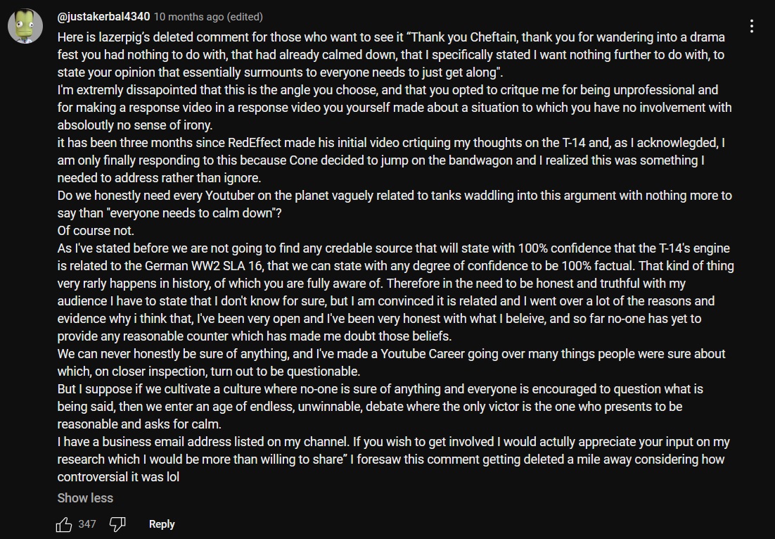 He has also been blatantly wrong when discussing the technical aspects of some systems in the past (T-14 video). Such incidents have caused pro-vatnik shills to rabidly dogpile him with criticism and decry everything he says as wrong and invalid, because he fucked up a 20-second long segment of an hour-long video where vatnik shills (Often Serbs for some reason), failed to refute any single one of his claims.