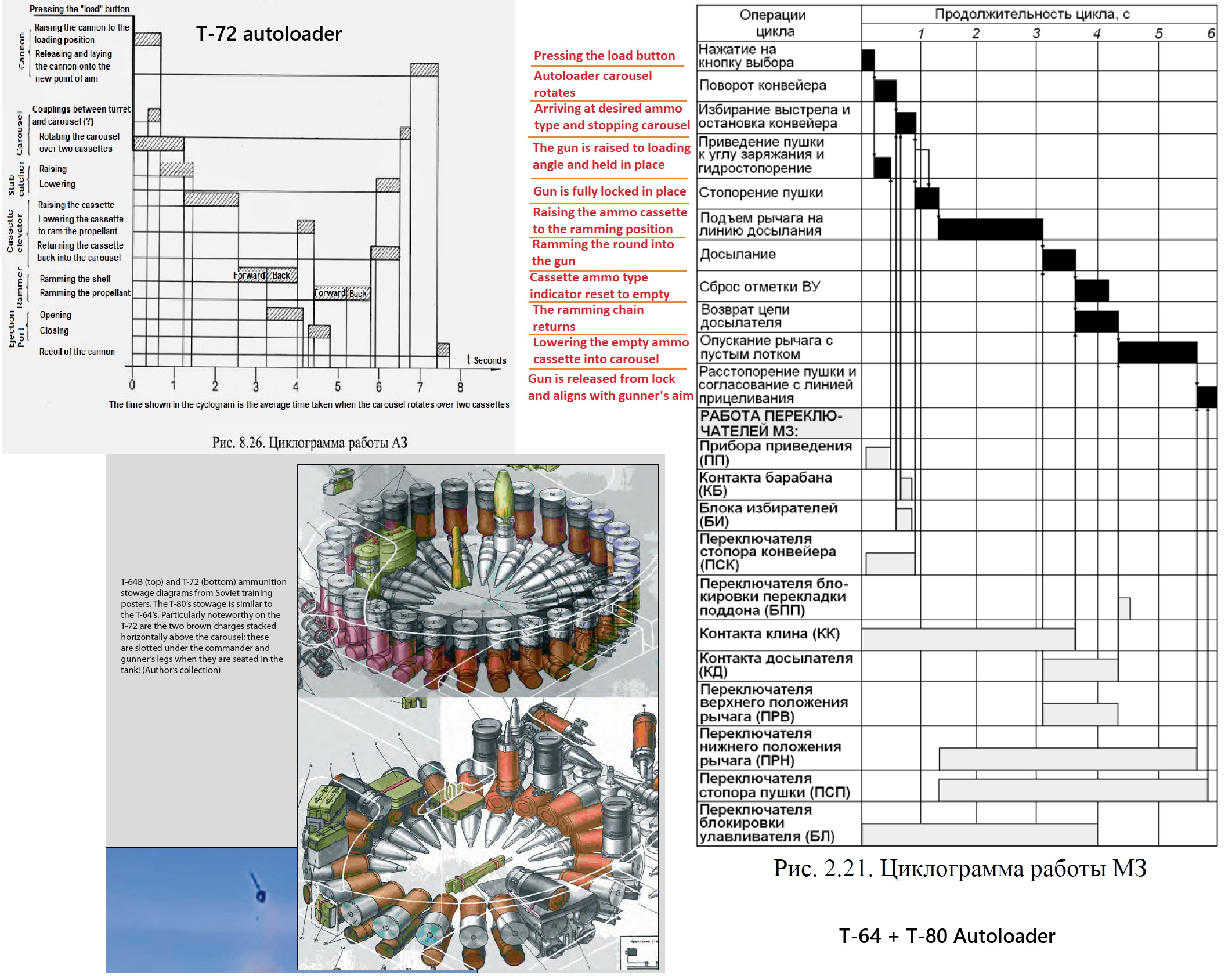 Both autoloaders can only rotate counter clockwise so if there is a round that you want to load but it is to the right of the round you just fired the autoloader is gona have to rotate all the way around to get it. T-64, T-80 autoloader is Hydraulic while T-72 autoloader is Electric.