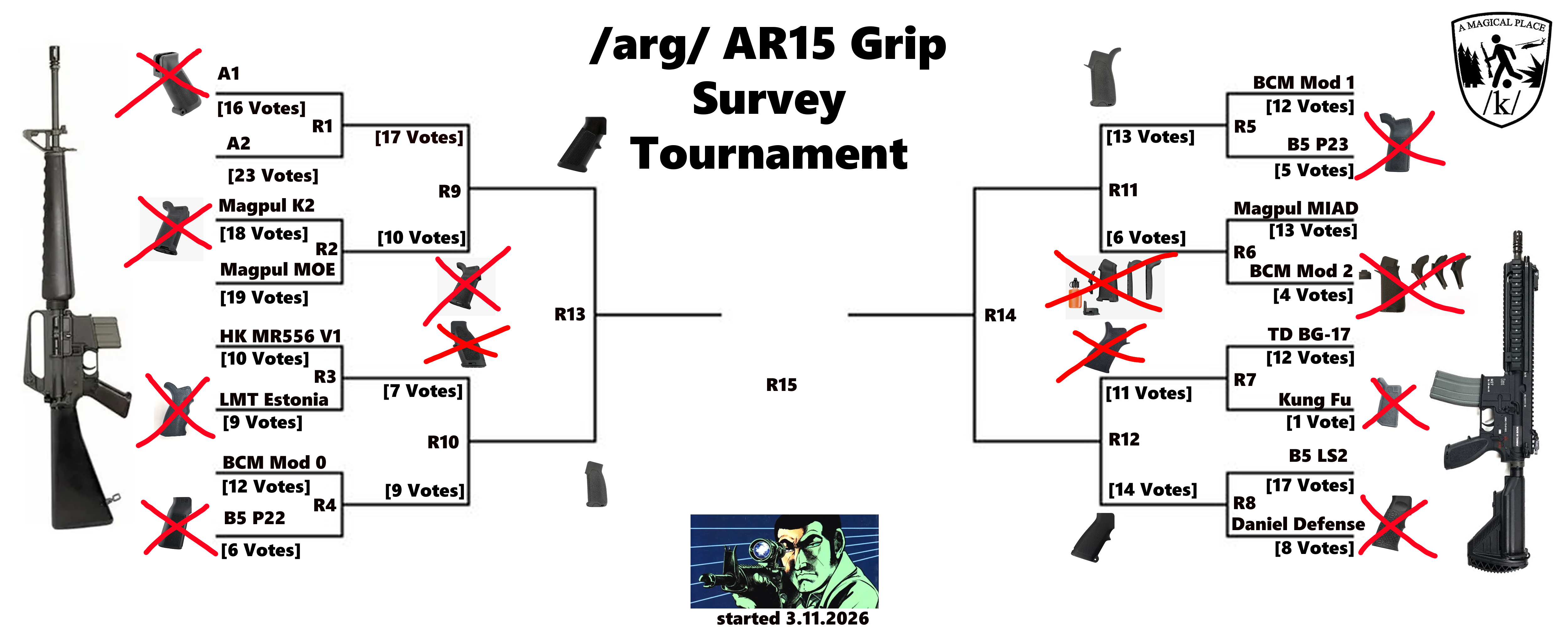 >>65003181>>65001542/arg/ AR15 Grip Survey TournamentThis will be updated every 24 hours hours and will be counted via StrawPoll.The B5 LS2 has won! A very close race.We have now entered the Semi-Finals! We need as many votes as possible from the denizens of /arg/!Round 13: A2 vs BCM MOD 0https://strawpoll.com/jVyG2q7oQZ7