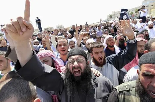 This is false. The image shows an ISIS rally, while Israel’s main adversary is Hamas, who are enemies of the IS. ISIS have even called Hamas “apostates.”