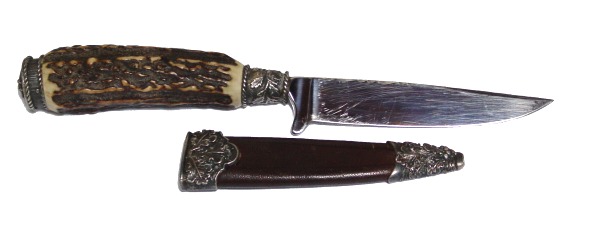 Scottish Sgian-dubh, nowadays worn in the top of the sock when wearing the kilt at formal events.Traditionally worn under the armpt or in the upper arm of your shirt as a surprise/self-defense weapon.