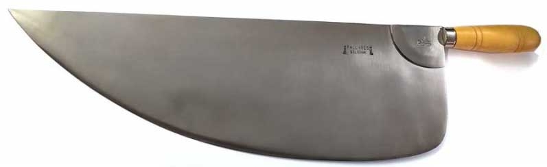 >>65008144Now that you mention it, I recall an example of that. I remember watching Anthony Bourdain visit Chan Che Kee, a famous cutlery company in Hong Kong. They whipped out a massive blade that was halfway between a cleaver and a brush ax, explaining that it was for "you know, when you need cut head off cow". IIRC it had that style of handle rather than the rat-tail tang and wooden handle typical on most kitchen knives.Speaking of Chan Chi Kee, we might as well talk about some other interesting blade designs. Picrel is a common pattern of butcher knife in Asia. It's specifically optimized for butchering hogs. These are heavy because they are so wide but the blades are maybe 1/4in thick at the handle and taper down towards the tip so they are really more of a super-wide knife than a "cleaver" IMHO.