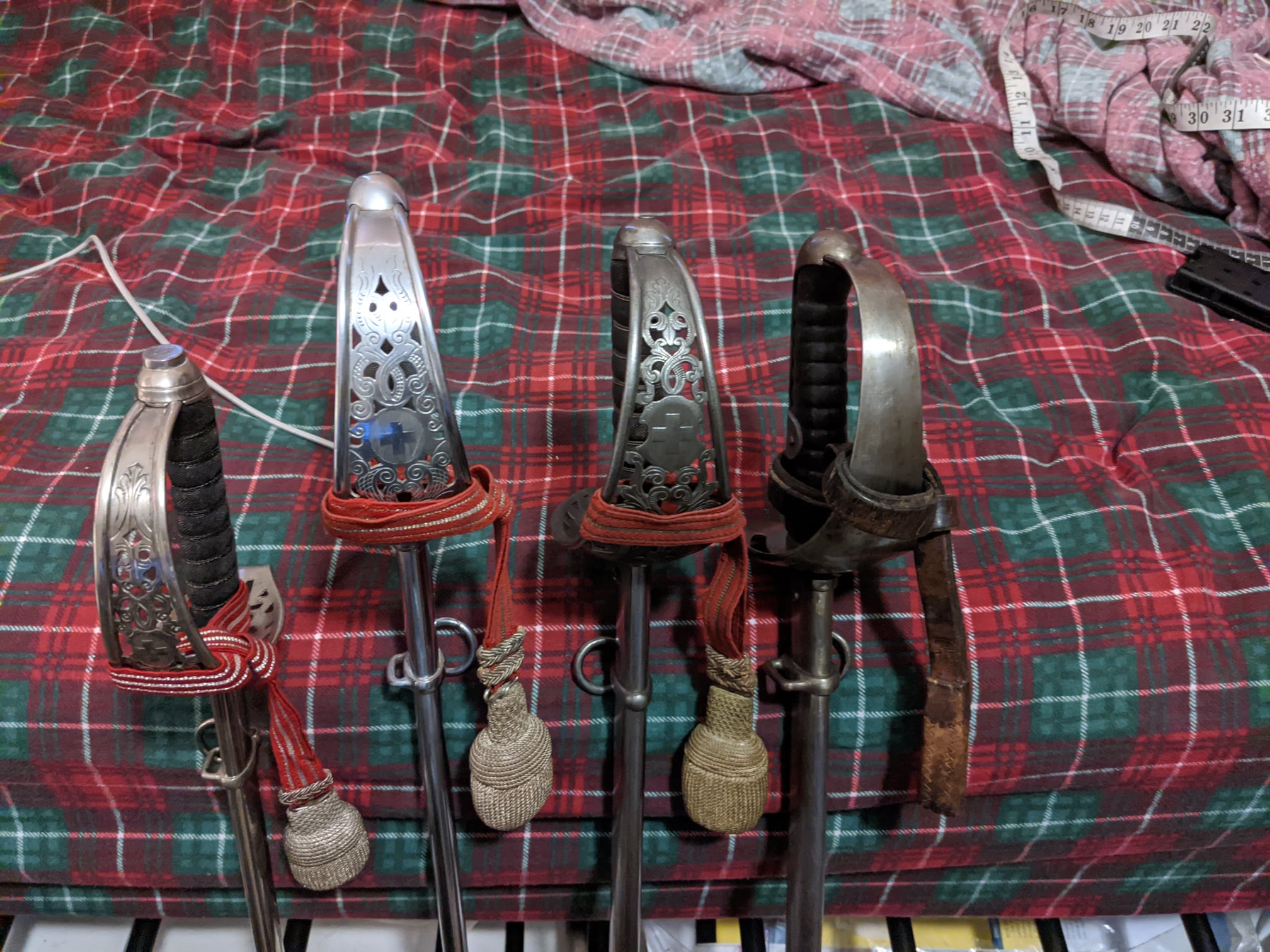 >>65051471Sword knots by the 19th century became turbo common. Both leather straps for actual usage by the cavalry and fabric/metal wire examples for officers and dress. But basically universal. UK, France, Sweden, etc. even the US had examples. BUT since I am autistic, the weird hallmark of German/Swiss/Austrian swords is the martingale or finger loop. A unique thing, you can see them most easily on Hessian, Wurttemberg, II Empire German 1889 officer swords, but most commonly on the Swiss 1867 and 1896/02 troopers/officers swords when applicable. The sword knot usually passed through there when tying for parade. But otherwise it is a holdover from one of those all-but-forgotten German cut fencing treatises of which they had 5000 of. You use 1 or 2 fingers through there and it helps to straighten your cut. On lighter blades a la academic and sporting purposes, you can use it as a final point of articulation, basically meaning you can whiff a cut but if you squeeze your finger at just the right time, the blade can still make enough contact to hit the opponent. Takes a lot of training to utilize properly but it is a final point of control that can be really fun. >Picrel are 1x1906/02, 2x1867 dismounted (infantry) officer, and 1x1899 officer Swiss swords, the first antiques I ever got with how IIRC the sword knot is supposed to be arranged