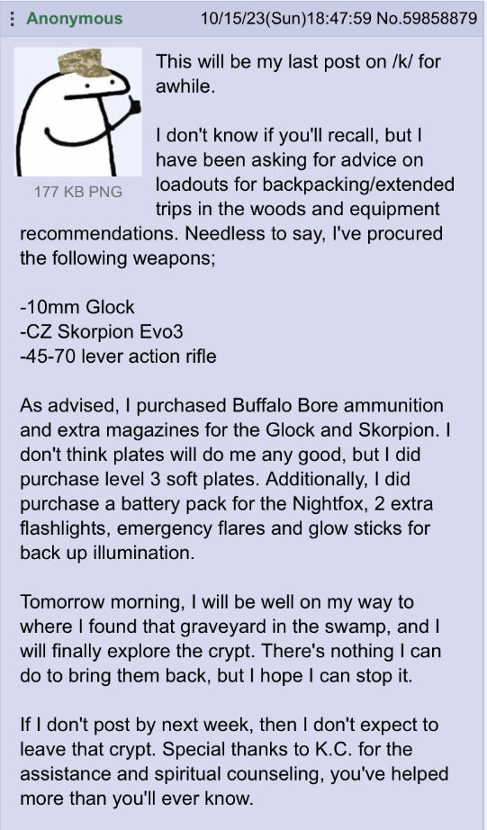 >>65006397I live innawoods, so packing my 22, taking no one, goal:be left the fuck alone.