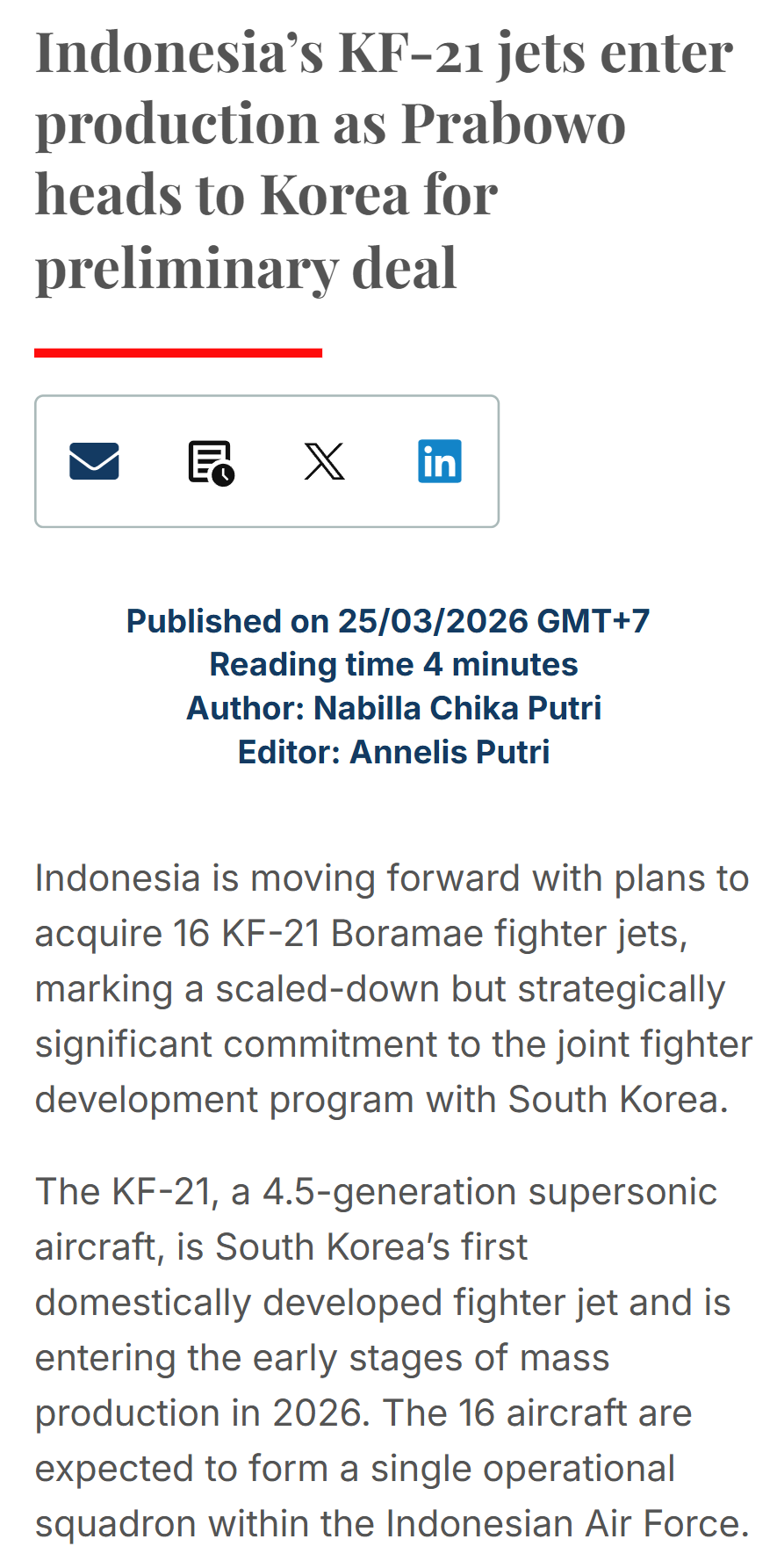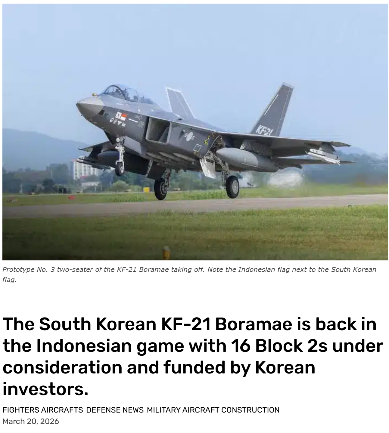 >>65014180>According to KBS World on March 19, 2026, South Korea’s Defense Acquisition Program Administration (DAPA) confirmed that a preliminary agreement for the aircraft has been reached. The jets will be produced by Korea Aerospace Industries (KAI), with a ceremonial signing expected during President Prabowo Subianto’s state visit to Seoul.>President Prabowo is scheduled to visit South Korea from March 31 to April 2, 2026, including a stop at KAI’s production facility in Sacheon, South Gyeongsang Province. The visit is expected to feature a preliminary export agreement signing with South Korean President Lee Jae-myung, while the legally binding implementation contract is set to be finalized following price negotiations later in the first half of the year.Yeah, the president of Indonesia is visiting South Korea to just watch K-POP concerts.