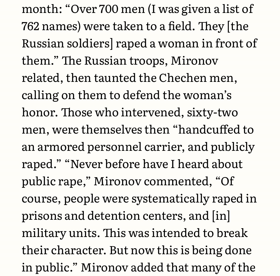 Too many to count based on one soldiers war. Still, it haunts me that an entire village was castrated because no one was willing to disclose the Chechen perpetrator. If I can recall, Russian soldiers were ambushed, killed, then nailed onto a wall in the shape of a cross for others to find. Other Russian soldiers interrogate the entire village where it happened and nobody talks; Balls were removed from all males in the village.