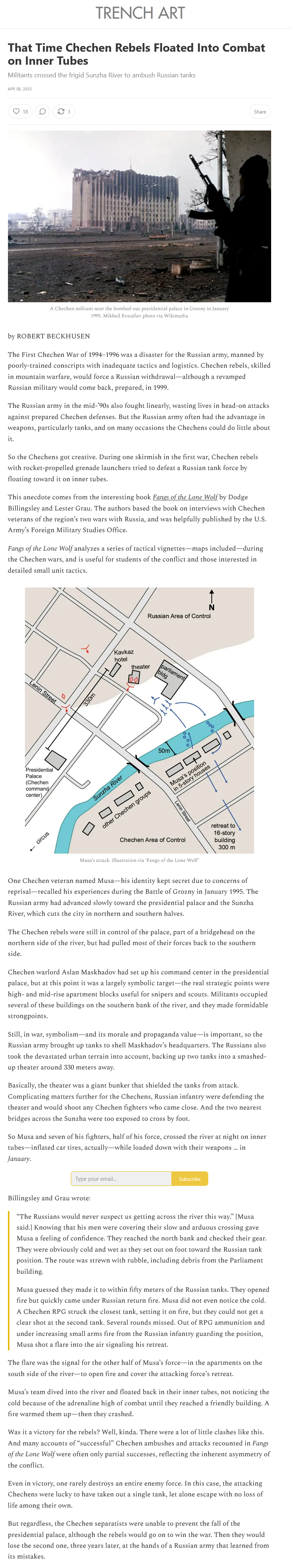 Another neat story is when Chechens used car tires to cross a river at night. The Chechens were hoping to knock out a tank parked inside of a partially collapsed theater as well as inflict massive casualties to those inside. The missions was a failure and the Chechens were forced to float back across to the other side.